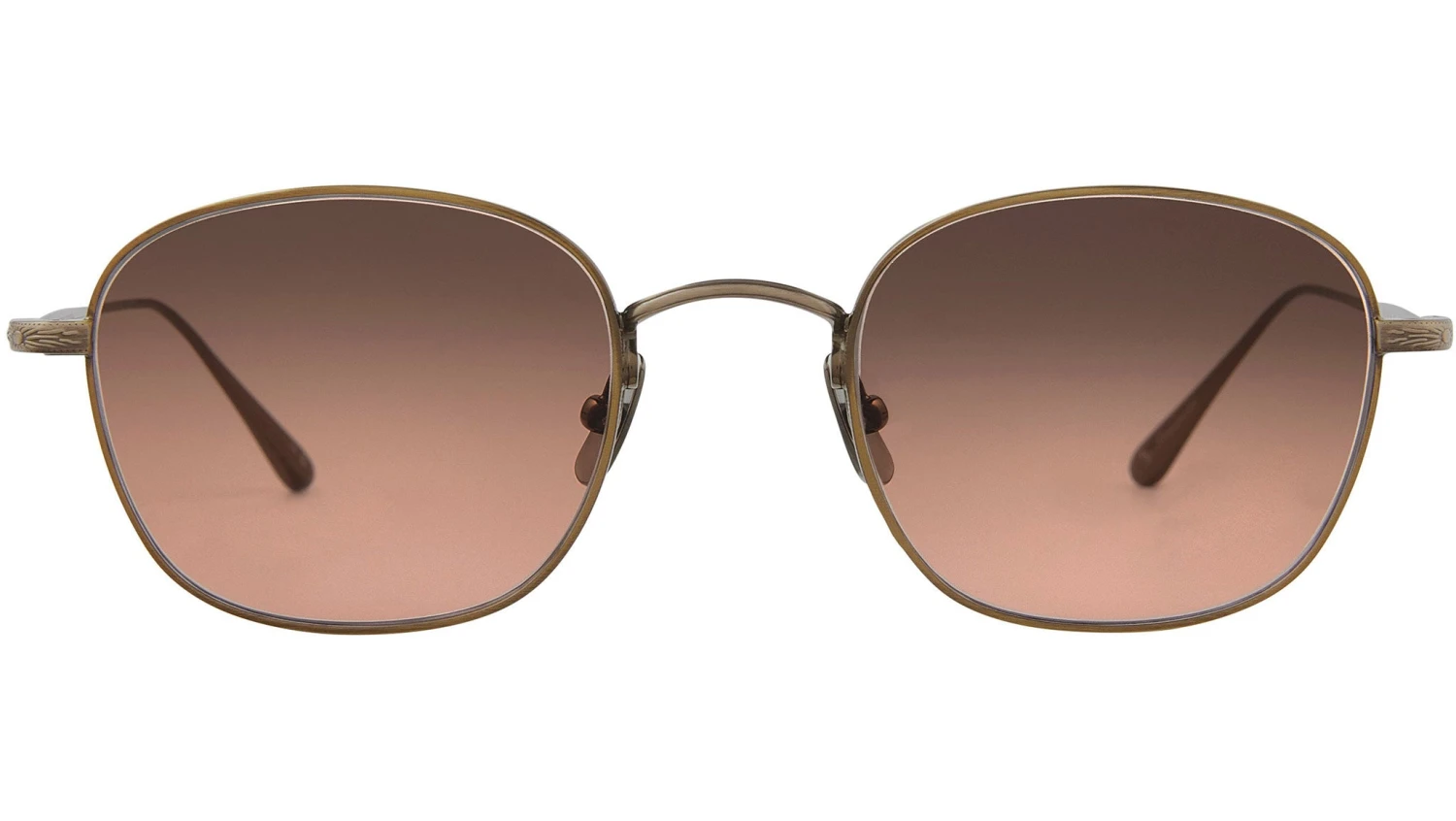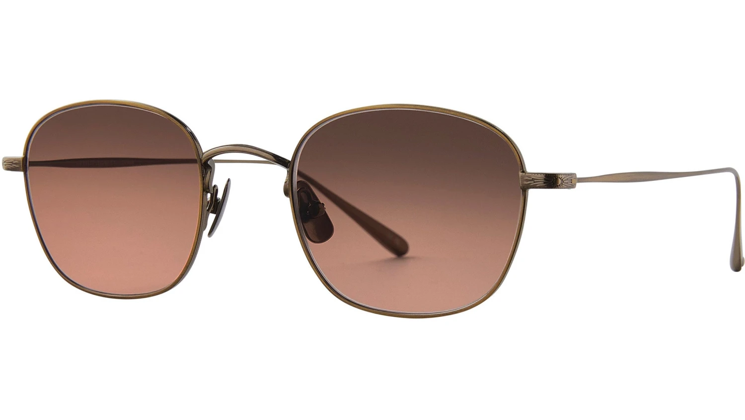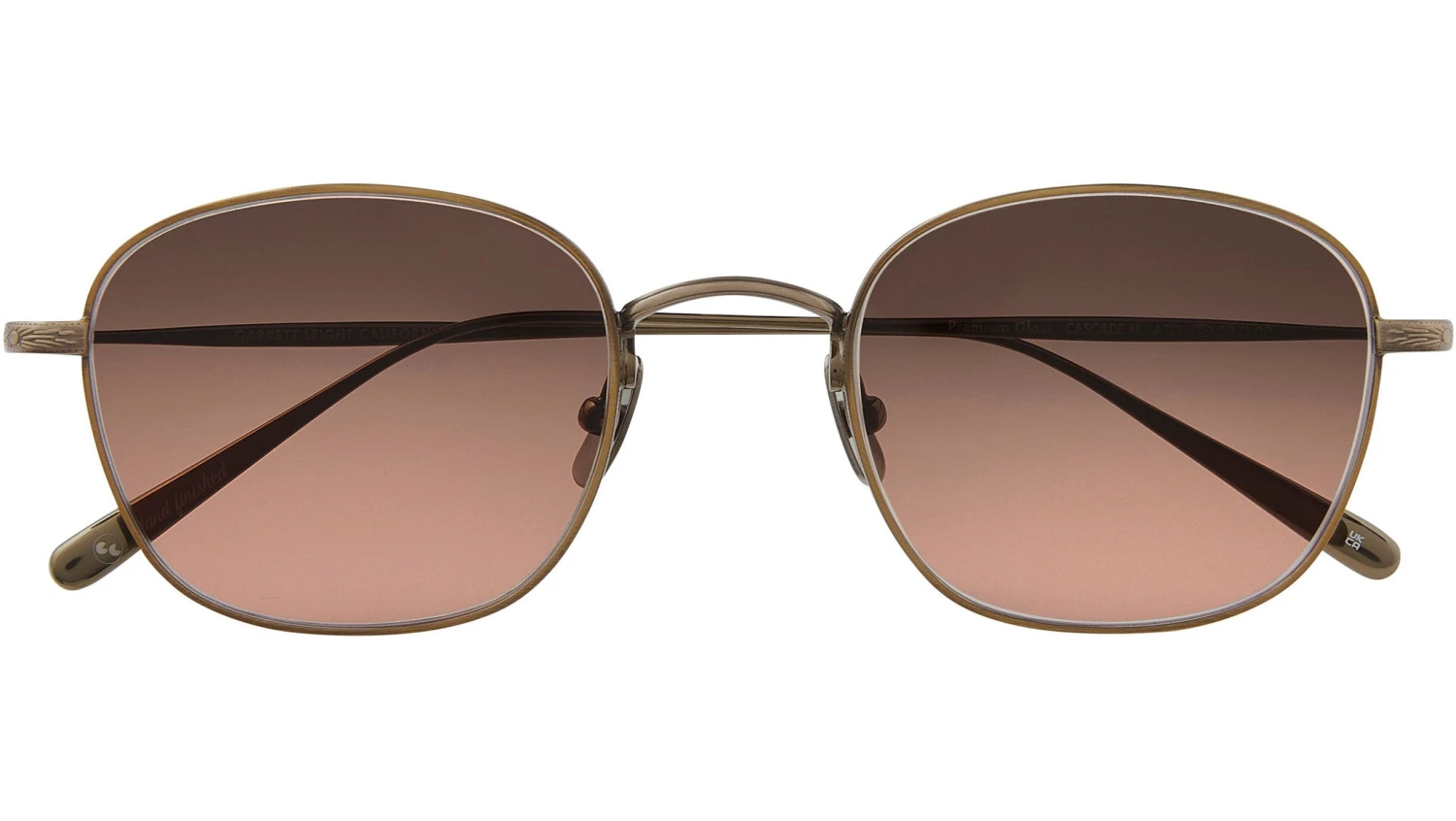 Garrett Leight Cascade M Sun sunglasses featuring antique gold oval metal frame and pure mojave gradient lenses. The Cascade M Sun features a timeless, softly squared metal frame distinguished by its ultra-thin and lightweight design. Engineered for durability and precision, this frame ensures a harmonious balance of strength and comfort. It includes custom etched Sun endpieces, coin edge eye rim filigree, and premium glass lenses, all set within all-metal temples. Notable specifications include titanium nose pads, a 4 base lens with backside anti-reflective coating, and 100% UV protection. Additionally, a GLCO soft case and cleaning cloth are included for convenience. This unisex design suits a modern aesthetic while delivering essential performance. Brand line: GLCO. Style code: 4068. Color code: ATG/PMOJG. Authorized Garrett Leight online reseller. Your glasses will include the original case and accessories and are covered by a 12-month global warranty.