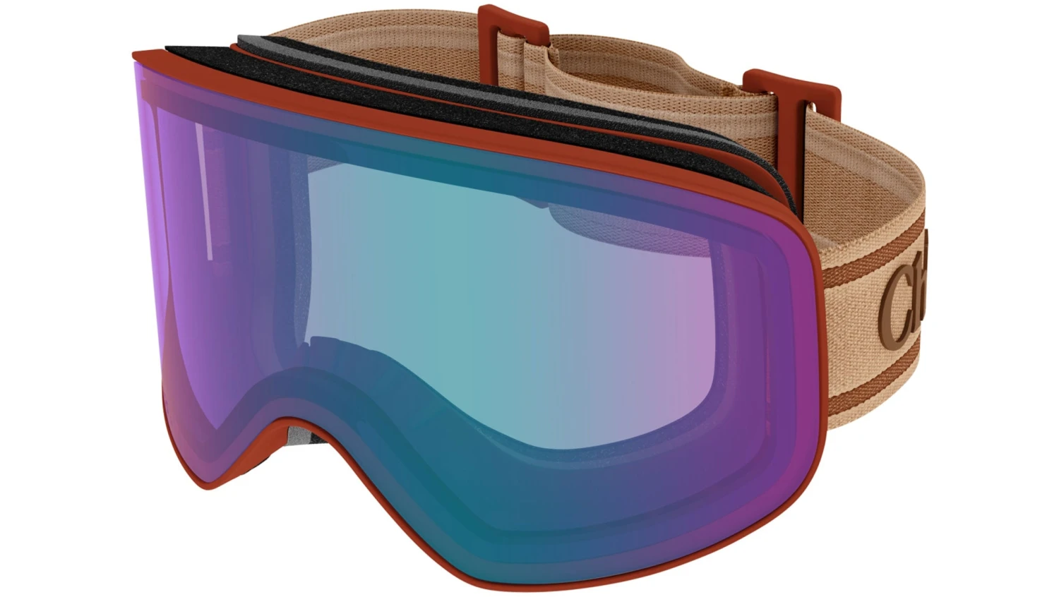 Chloé ski goggle model CH0072S shield injection frame color code 003 matte solid rust with brown temple and solid orange + multilayer blue goggle cylindrical mask lens.