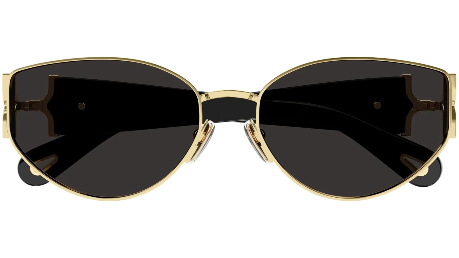 Chloé CH0260S 001 sunglasses for women, featuring shiny classic gold panthos metal frame and solid grey bio nylon lenses. Brand line: Chloé. Style code: CH0260S. Color code: 001. Made in Japan. Authorized Chloé online reseller. Your glasses will include the original case and accessories and are covered by a 12-month global warranty.