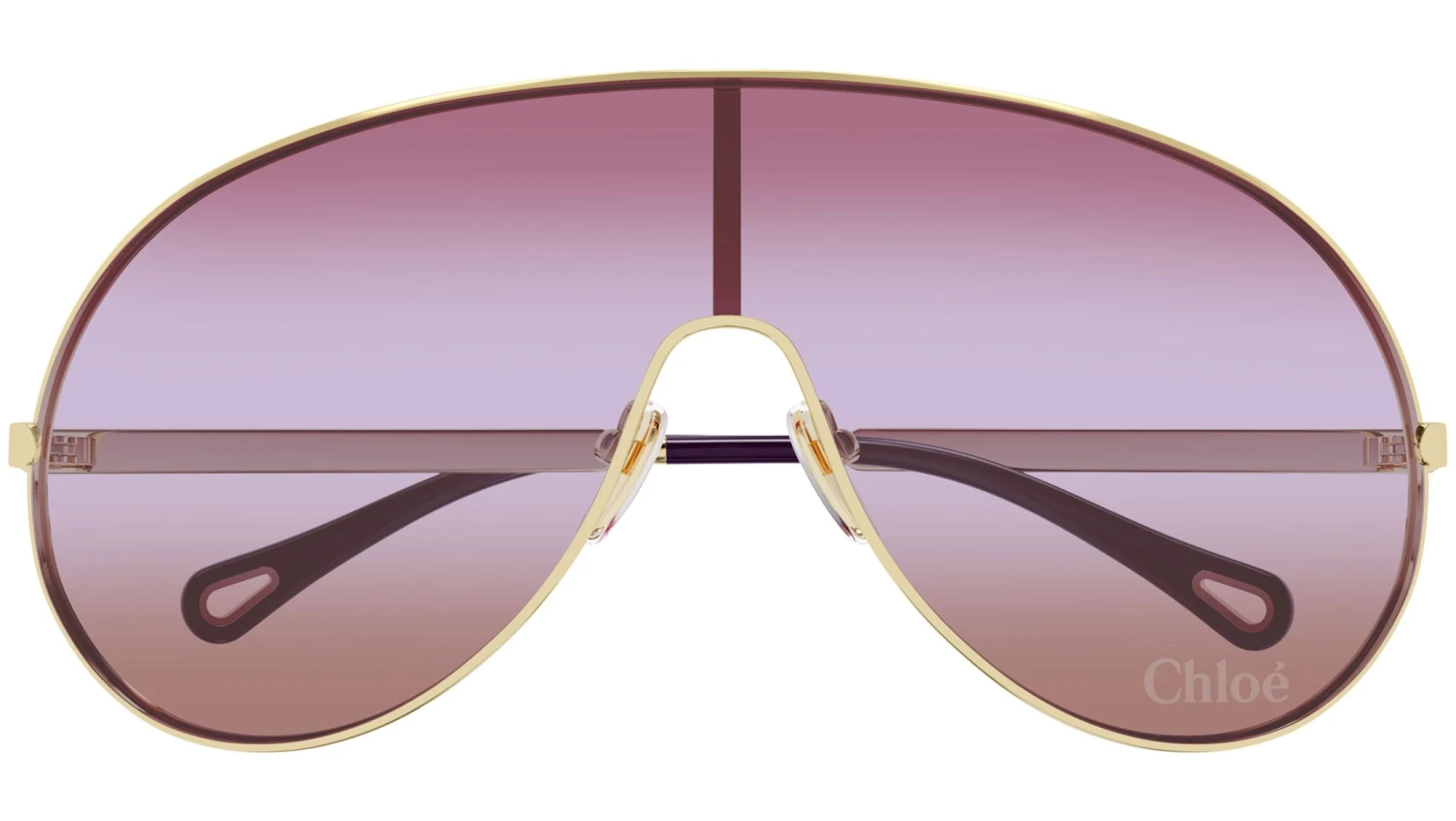 Chloé CH0283S 003 sunglasses for women, featuring shiny classic gold shield metal frame and triple gradient red / pink / brown mask bio nylon lenses. Brand line: Chloé. Style code: CH0283S. Color code: 003. Made in Italy. Authorized Chloé online reseller. Your glasses will include the original case and accessories and are covered by a 12-month global warranty.
