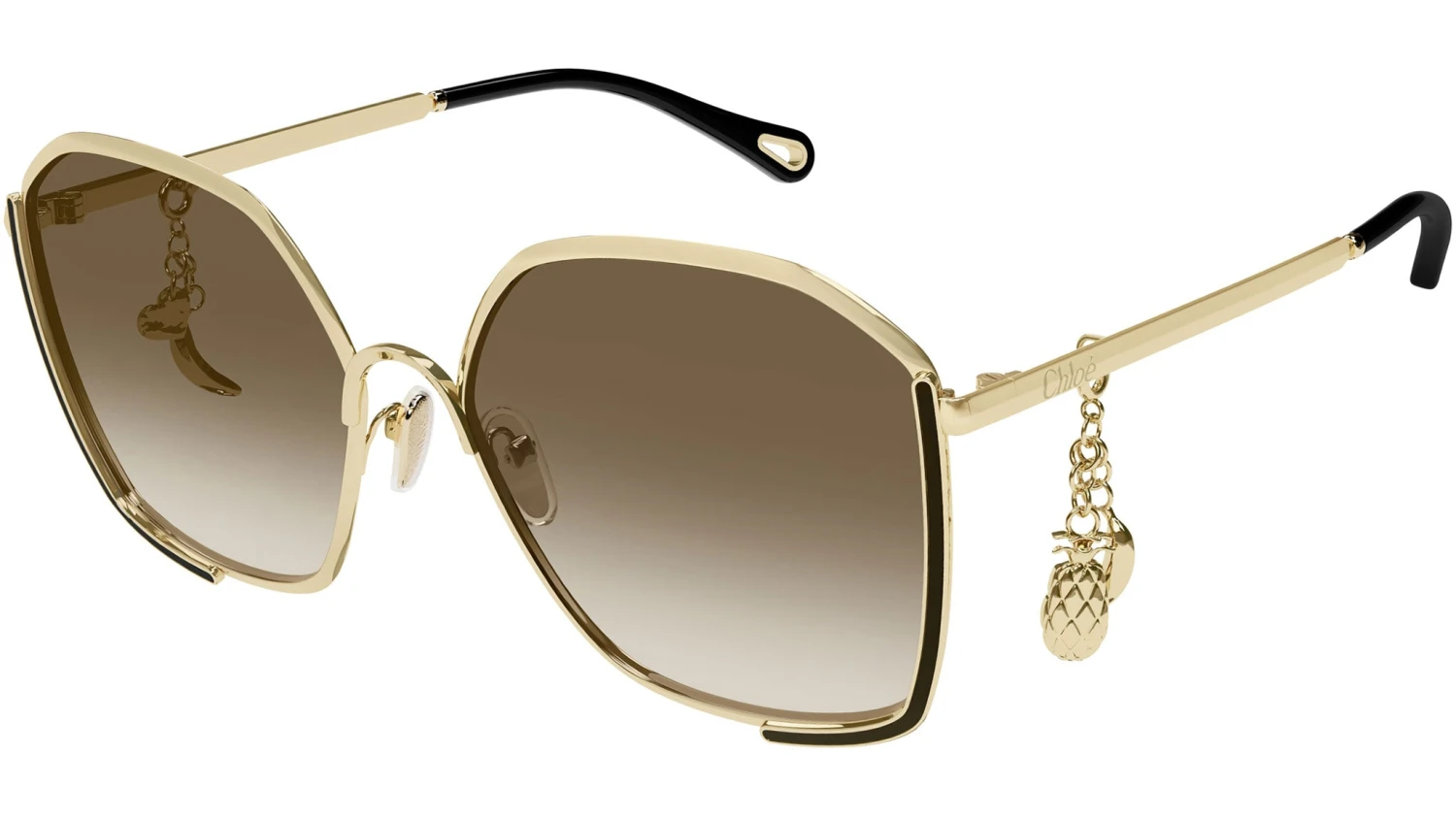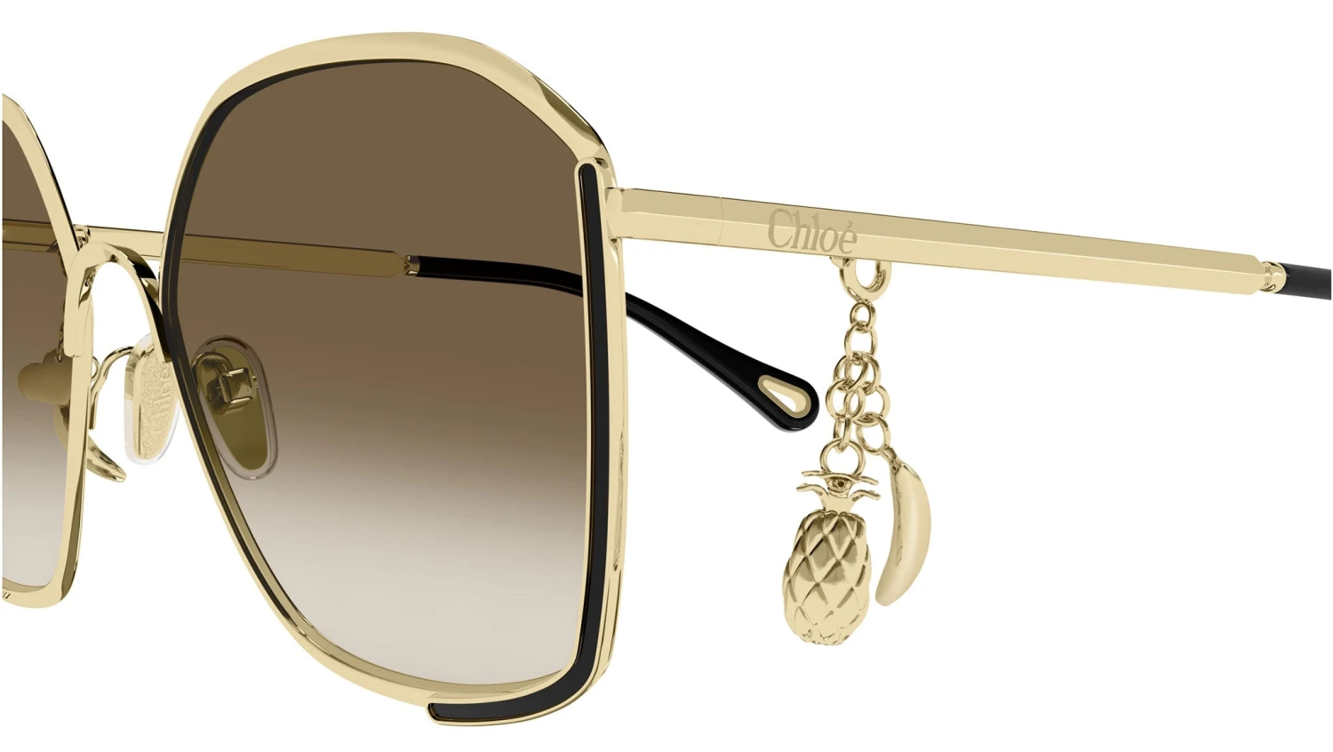 Chloé CH0288S 001 sunglasses for women, featuring shiny classic gold / black enamel rectangular metal frame and gradient brown bio nylon lenses. Brand line: Chloé. Style code: CH0288S. Color code: 001. Made in Italy. Authorized Chloé online reseller. Your glasses will include the original case and accessories and are covered by a 12-month global warranty.