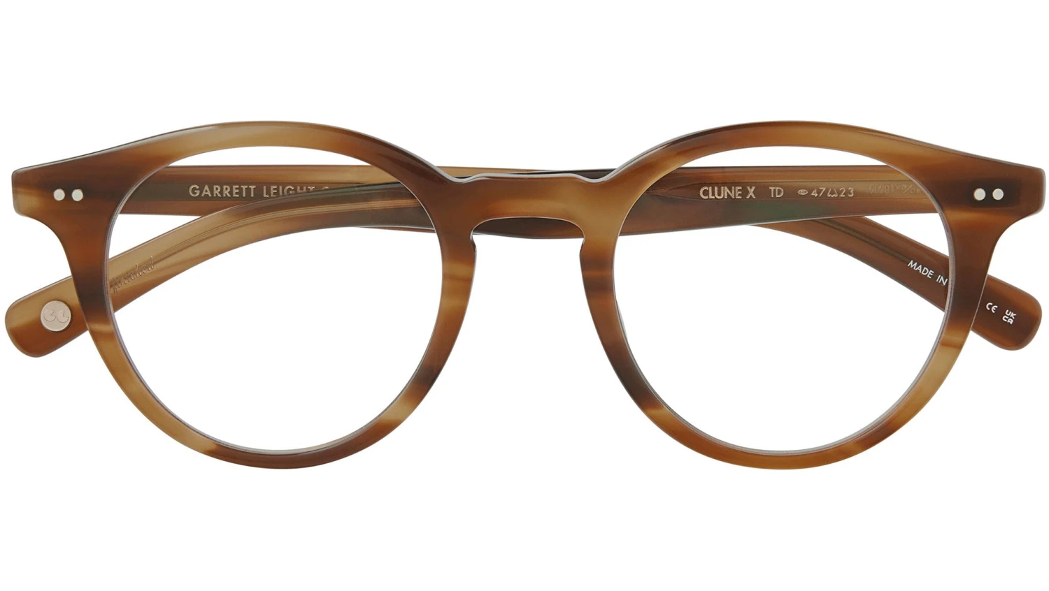 Garrett Leight Clune X glasses featuring true demi round acetate frame and demo lens lenses. The Clune X frame, inspired by mid-century design, features a P3 silhouette with a thicker acetate than its predecessor. It incorporates a classic core wire and double pins at the endpiece, ensuring a durable and stylish construction. Key specifications include hand-finished optical quality CR-39 lenses, cured cellulose acetate, a keyhole nose bridge, and a 4 base lens with a backside anti-reflective coating. Additionally, it boasts 5 barrel hinges with real rivets and external pins for enhanced stability. Each frame comes with a soft case and cleaning cloth, making it a versatile and practical choice for all. Brand line: Forever Classics. Style code: 1129. Color code: TD. Authorized Garrett Leight online reseller. Your glasses will include the original case and accessories and are covered by a 12-month global warranty.