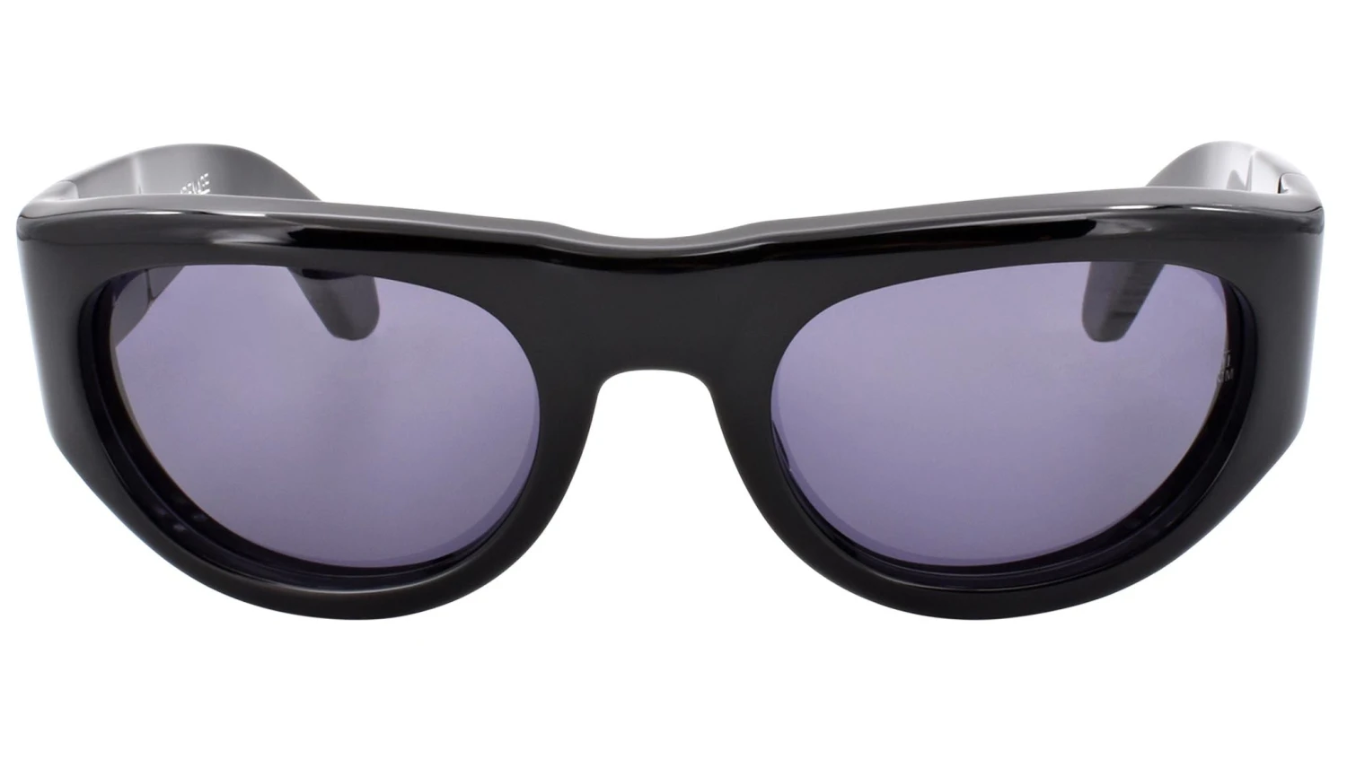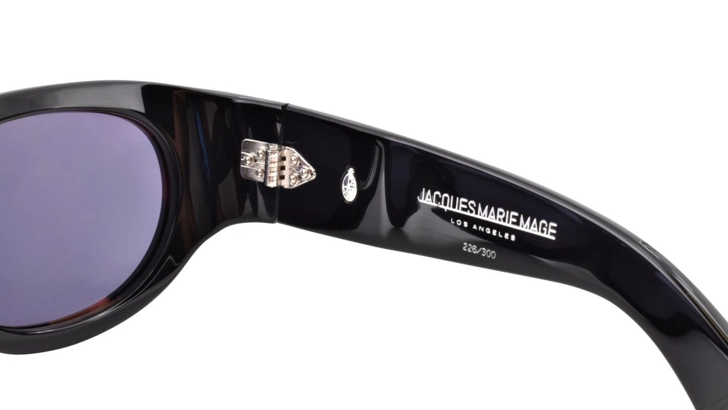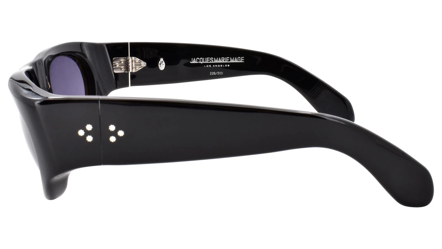 Material: 10mm block, polished black acetate frame, custom double laminated acetate temples ft. precious metal hardware in sterling silver. Lens color: jet.