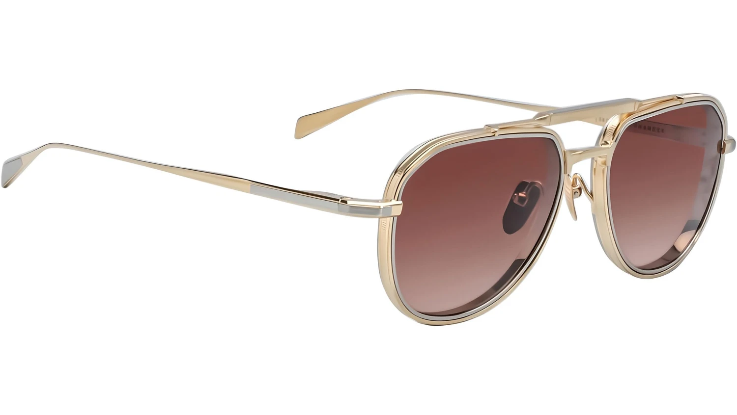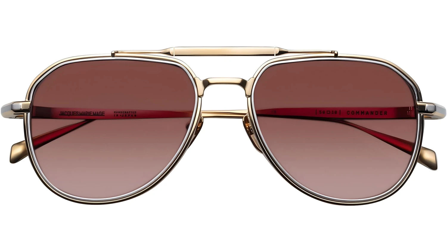 Dark gold 100% beta titanium frame with silver titanium inserts and red gradient lenses. Features dark gold hairline-engraved titanium temples with wing tips, a dark gold tension-secured custom hidden hinge, and silver titanium eyerim inserts. Custom nose pads with logo and hairline engraving enhance the refined design. Tuscan gradient CR-39 4 base lenses with backside anti-reflective treatment ensure clarity and comfort. Provides 100% UV protection.