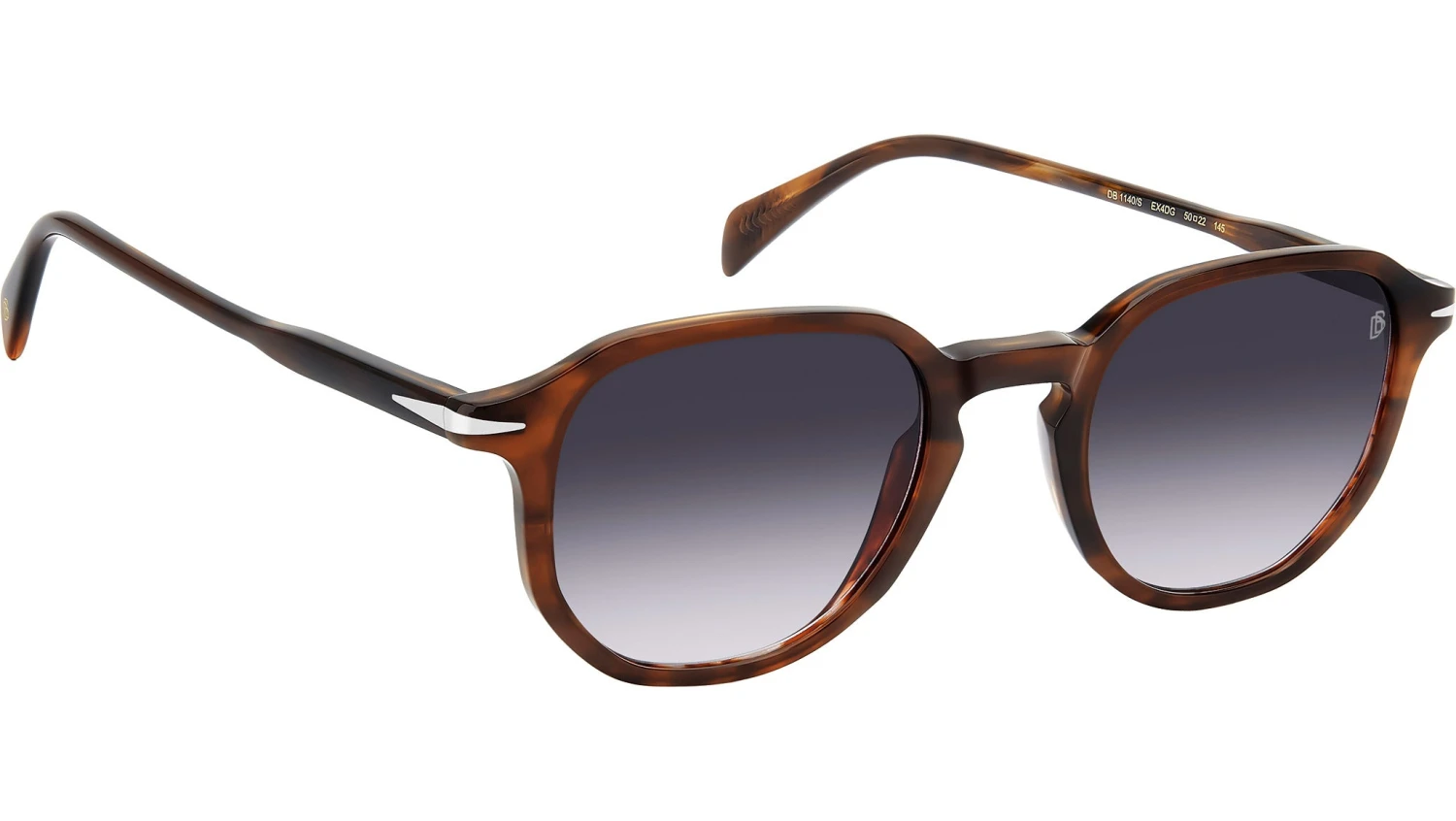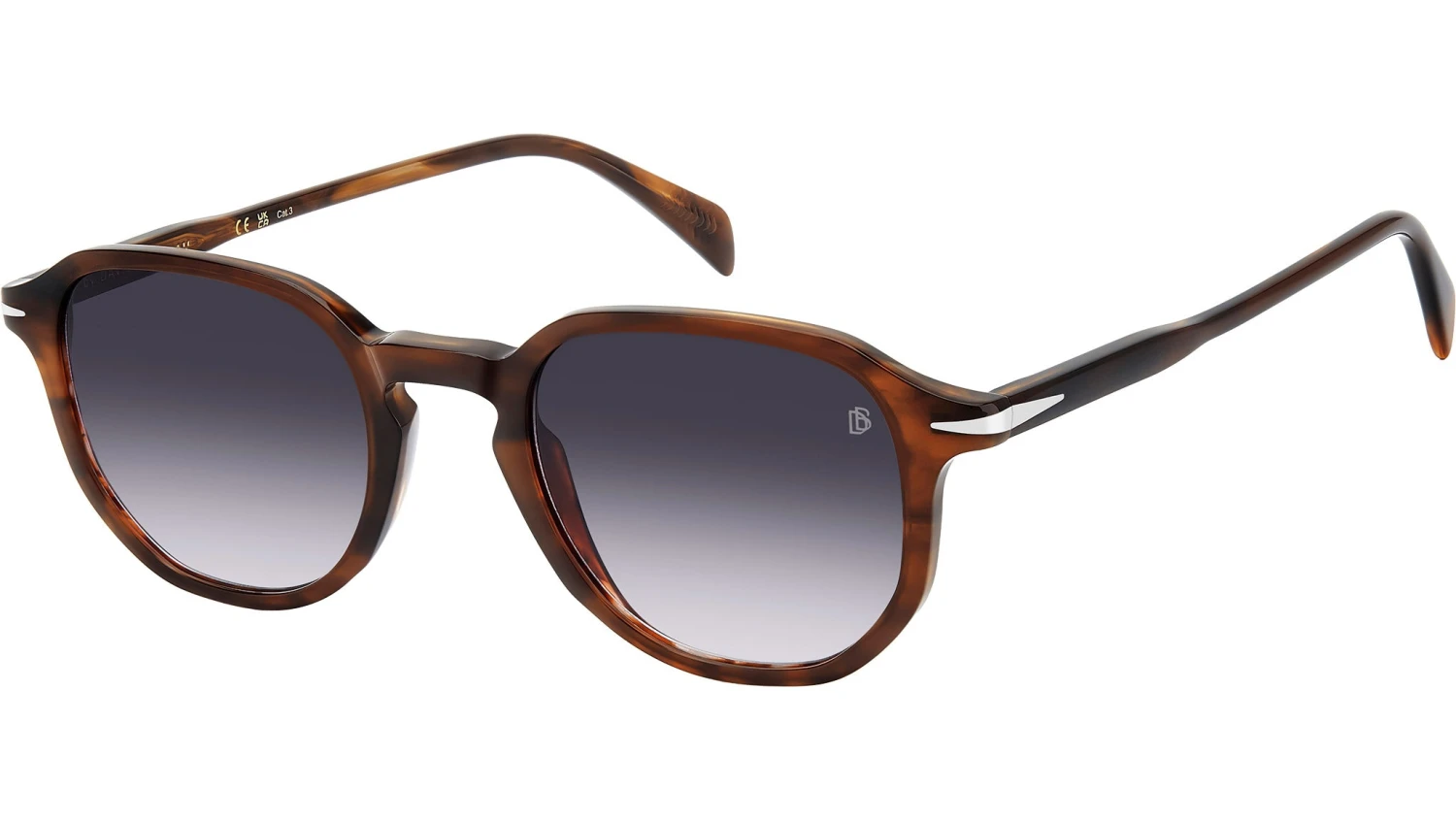David Beckham DB 1140/S EX4 DG sunglasses for men, featuring brown horn rectangular acetate frame and violet shaded lenses. Brand line: Timeless Icons. Style code: 206607. Color code: EX4 DG. Authorized David Beckham online reseller. Your glasses will include the original case and accessories and are covered by a 12-month global warranty.