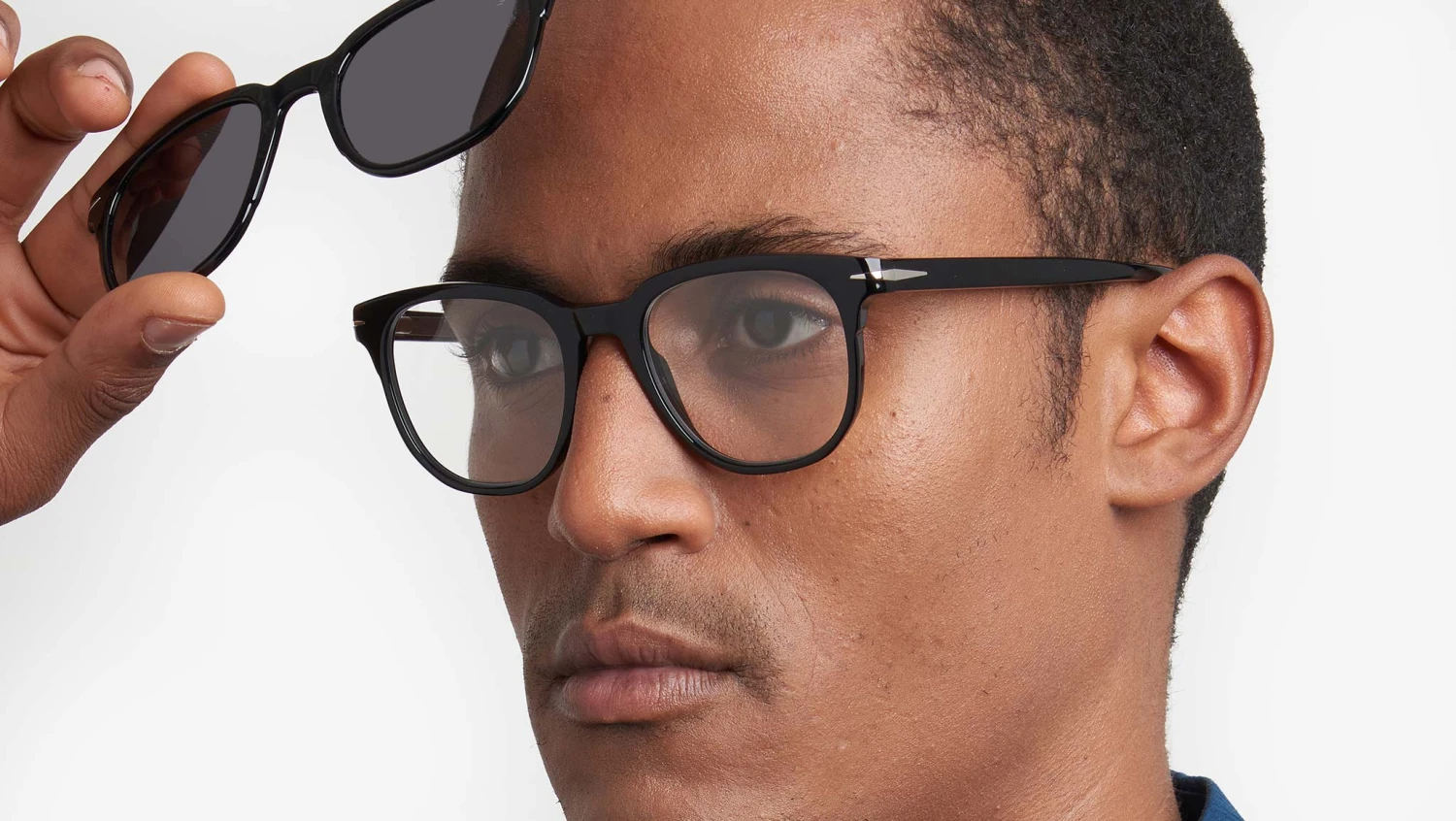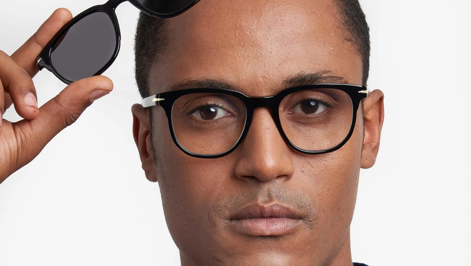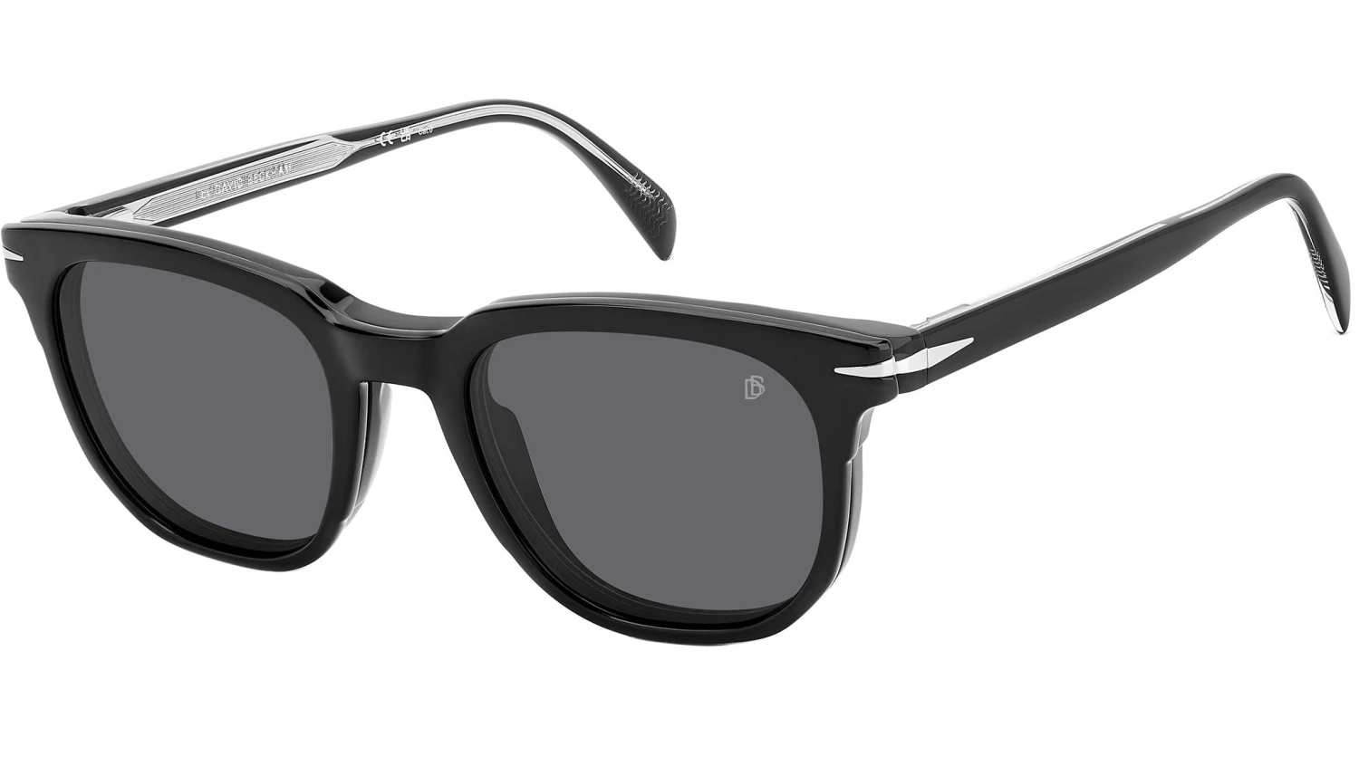 David Beckham sunglasses model DB 7120/CS color code 807 M9 black. These eyeglasses with clip-on sun lenses are classic yet undeniably cool. Perfect for every adventure, the sun lenses attach to the frames quickly and easily, for impeccable vision even on bright, sunny days. The acetate structure comes in plain or two-tone colorways, and with temples with a visible wire core. David Beckham’s signature details are a must: the stylized rhombus, the full name of the brand on the inner temple, and the monogram on the sun lenses.