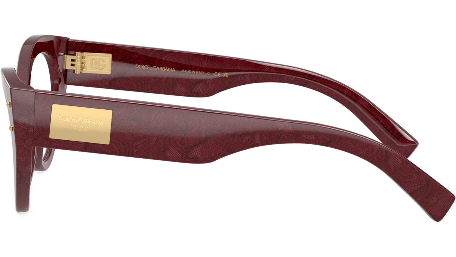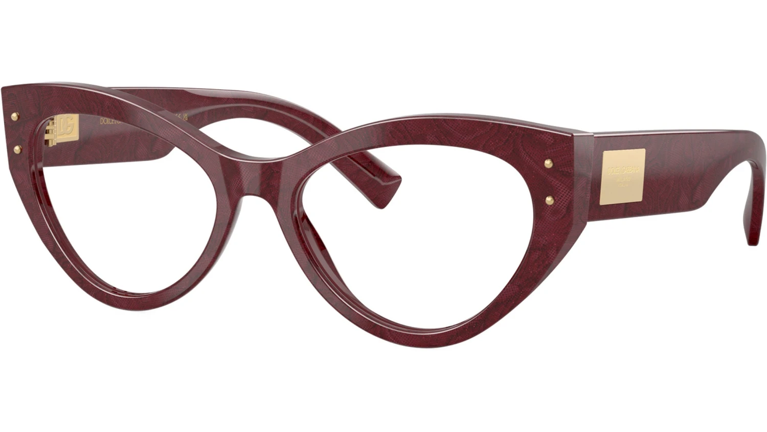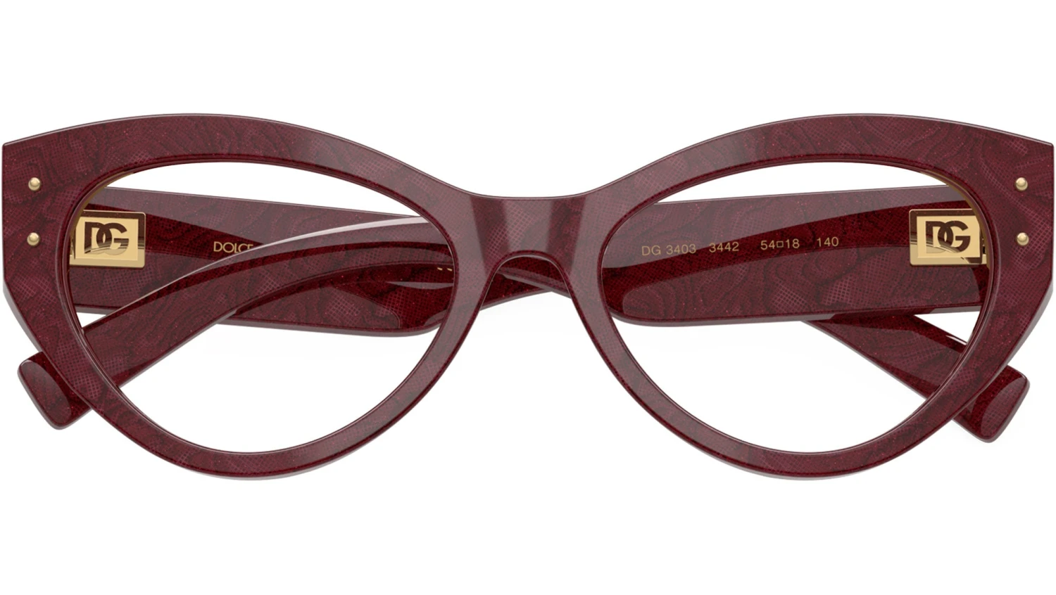 Dolce & Gabbana optical frame for for women model 3403 featuring bordeaux lace full rim acetate frame and base 4 demo lens. High bridge fit. Frame line: Dna. Brand code: 0DG3403. Color code: 3442. Authorised Dolce & Gabbana Online Reseller. Your glasses will come including the original case and accessories and will be covered by 12 month global warranty.