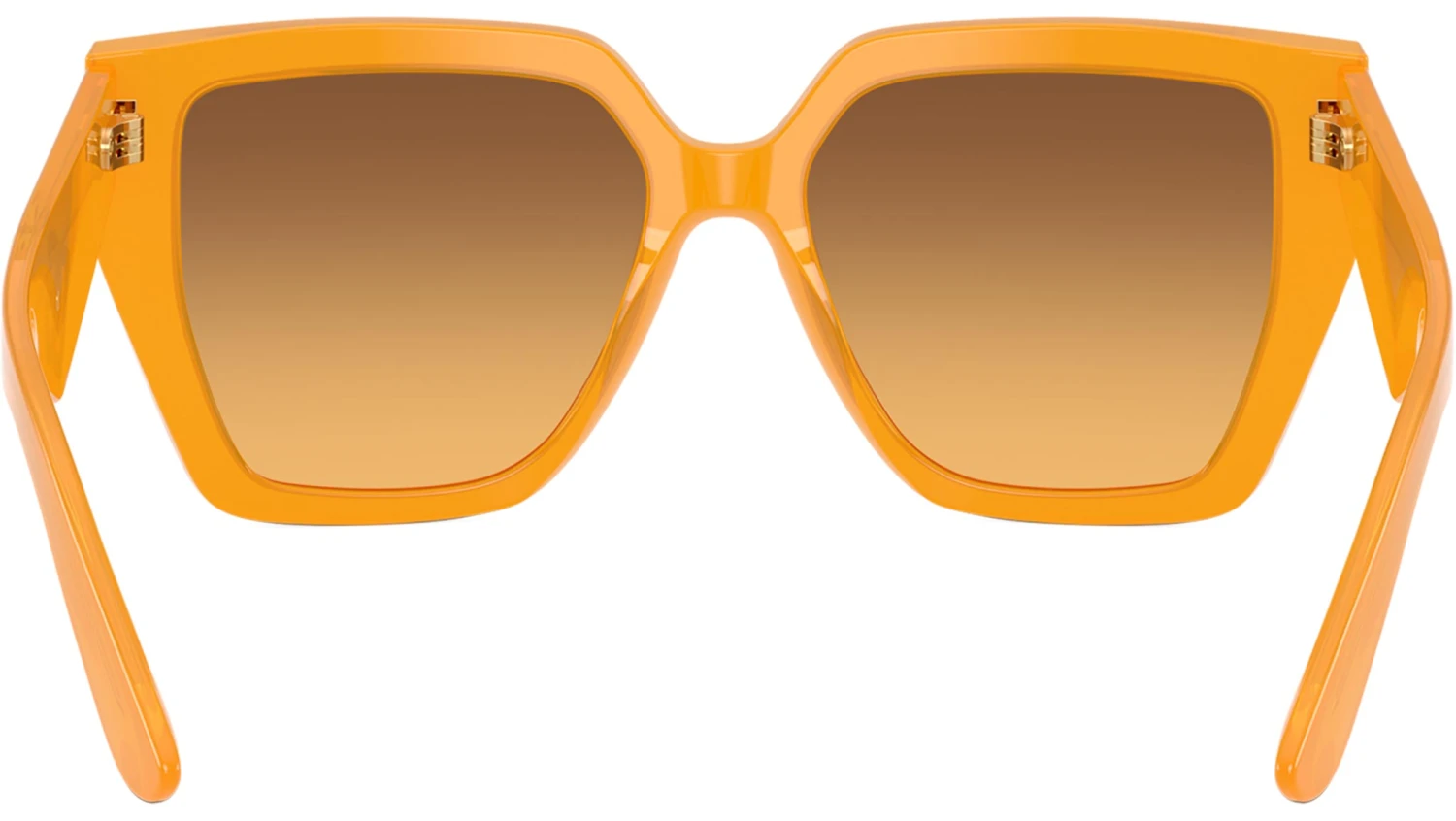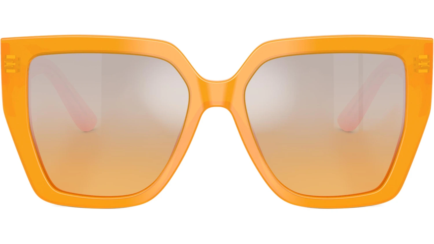 Dolce & Gabbana DG 4438 30467H sunglasses for women, featuring opal orange squared acetate frame and orange mirror silver gradient nylon lenses. High bridge fit. Brand line: Dna. Style code: 0DG4438. Color code: 30467H. Made in Italy. Authorized Dolce & Gabbana online reseller. Your glasses will include the original case and accessories and are covered by a 12-month global warranty.
