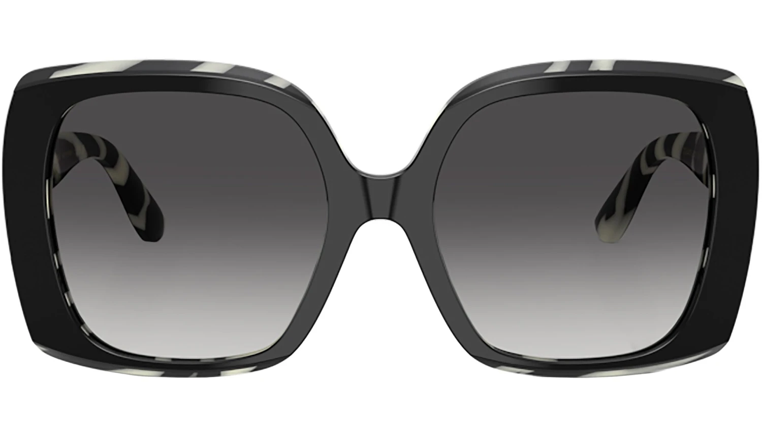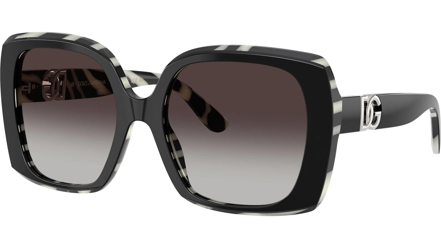 Dolce & Gabbana sunglasses for for women model 4475 featuring black on zebra full rim acetate frame and base 4 grey gradient lenses. High bridge fit. Frame line: Dna. Brand code: 0DG4475. Color code: 33728G. Authorised Dolce & Gabbana Online Reseller. Your glasses will come including the original case and accessories and will be covered by 12 month global warranty.