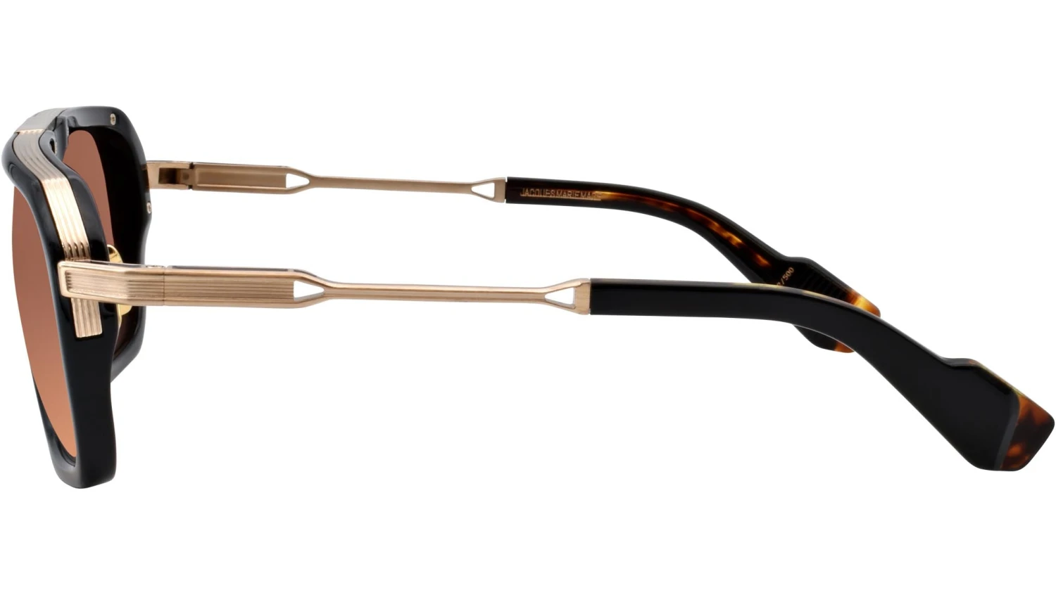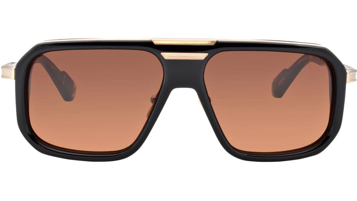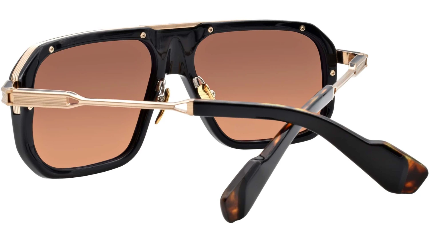 Bold and boxy acetate frame with streamlined titanium temples and brow bar. Ideal for faces that need a more generous fit. Black 9mm cured cellulose acetate front with combo temples featuring double laminated temple tips and brown gradient lenses. Black acetate front. Dark gold titanium temples with black epoxy detailing and black acetate temple tips. Dark gold tension-secured custom le mans hinge. Custom dark gold nose pads with logo and hairline engraving. 6 base tuscan gradient lens with backside anti-reflective treatment. 100% UV protection.