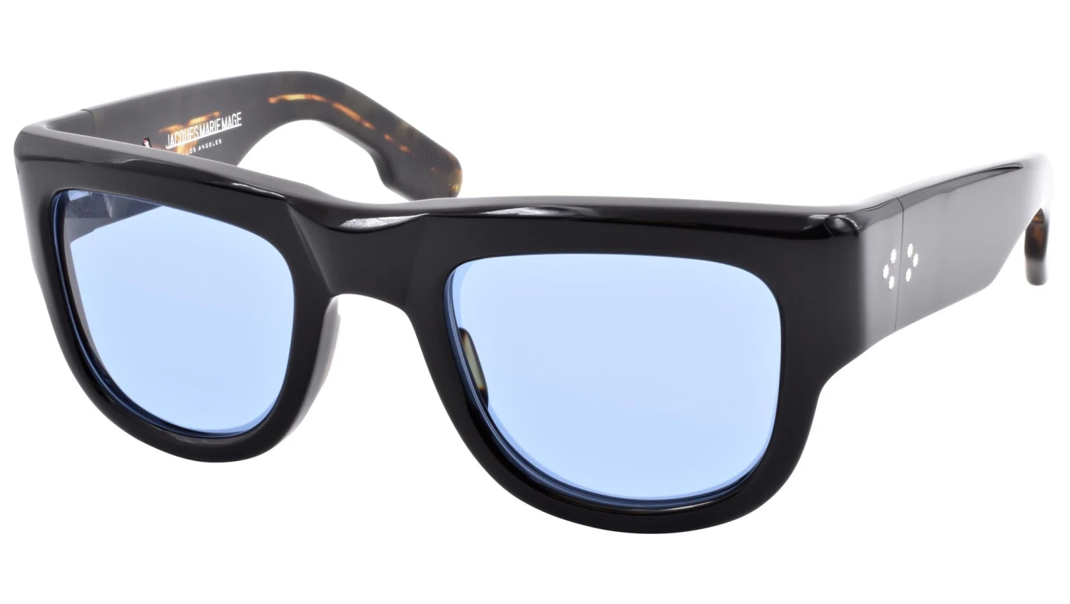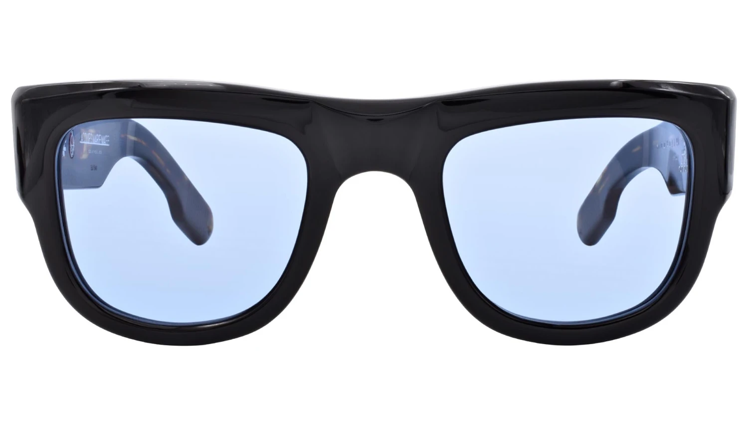 Material: 10mm block, polished black acetate frame, custom double laminated acetate temples ft. Precious metal hardware Hardware: silver polished – Lens: cerulean CR-39. Handcrafted in Japan