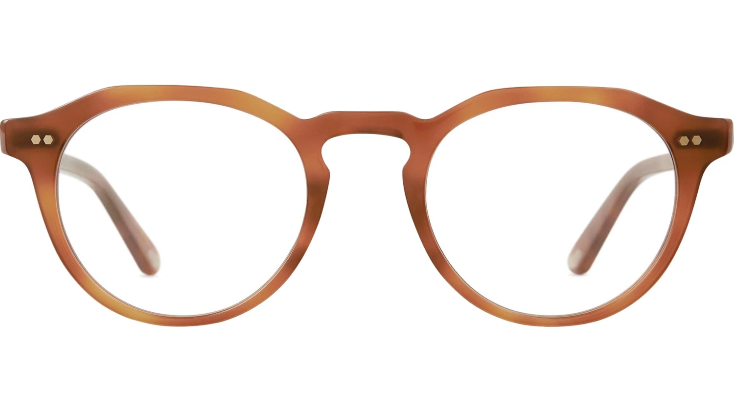 Mr. Leight Dorian C glasses featuring amber tortoise / antique gold oval acetate frame and demo lenses. The Dorian C glasses showcase a sophisticated oval shape enhanced by a distinctive angled acetate top line, resulting in a striking yet refined silhouette. This model elegantly combines classic design elements with modern aesthetics, offering a timeless look infused with contemporary appeal, ideal for individuals who value understated elegance with a bold, architectural edge. Handcrafted in Japan, the glasses feature optical quality CR-39 lenses, a custom woodgrain core wire filigree, and a temple tip decal. Additional specifications include a 4-base lens with a backside anti-reflective coating, a geo plaque, and a keyhole nose bridge. Custom hexagon riveted pins adorn the front, while the hinge is expertly constructed with a custom engraved three-barrel design featuring an enamel-filled Mr. Leight logo cap. This unisex model is perfect for anyone seeking stylish and high-quality eyewear. Style code: ML1058. Color code: AMT-ATG. Authorized Mr. Leight online reseller. Your glasses will include the original case and accessories and are covered by a 12-month global warranty.