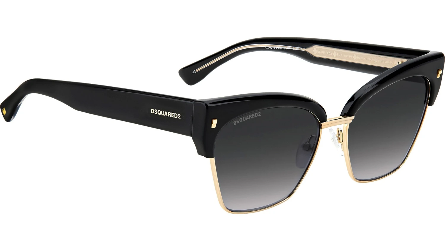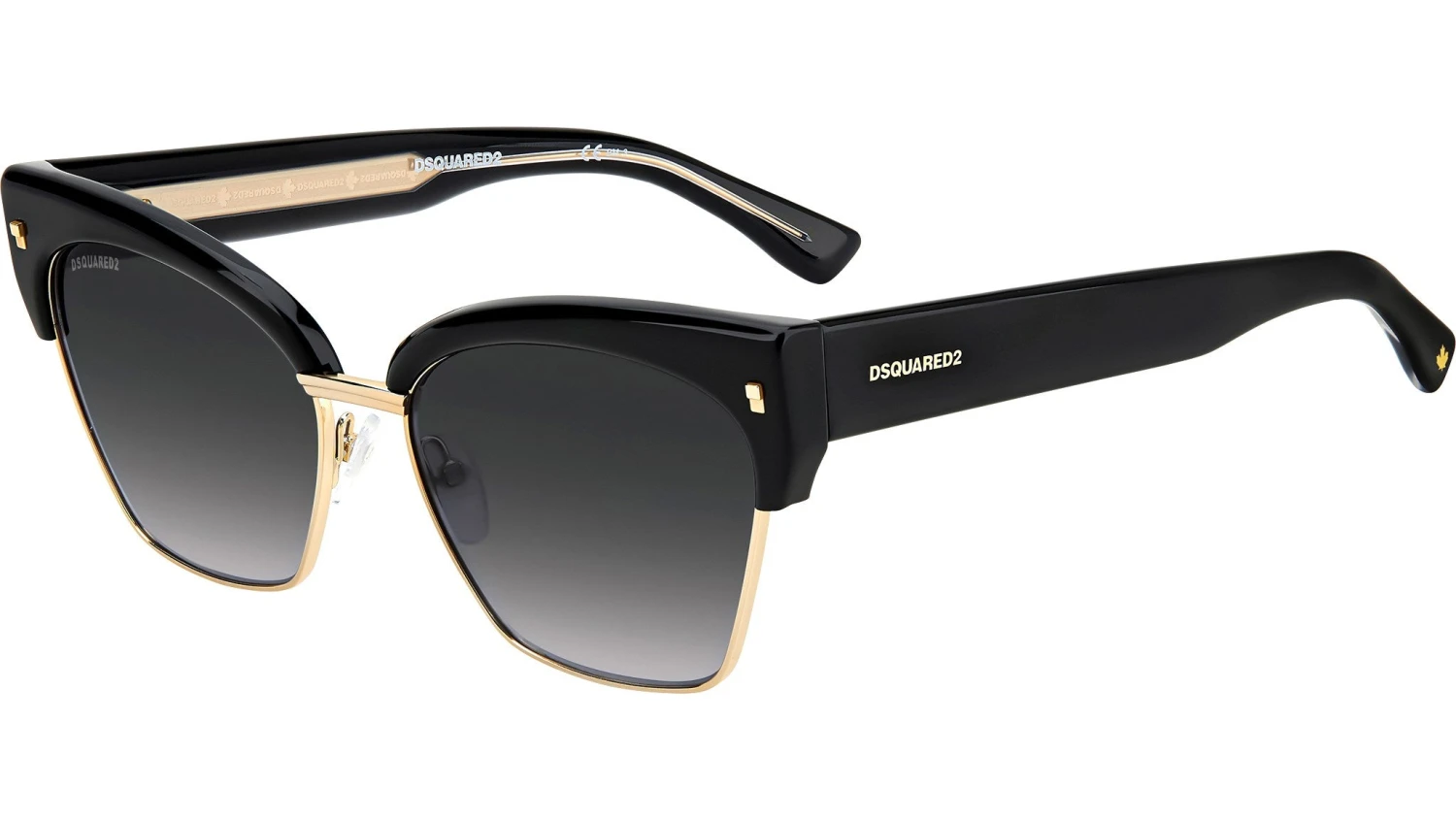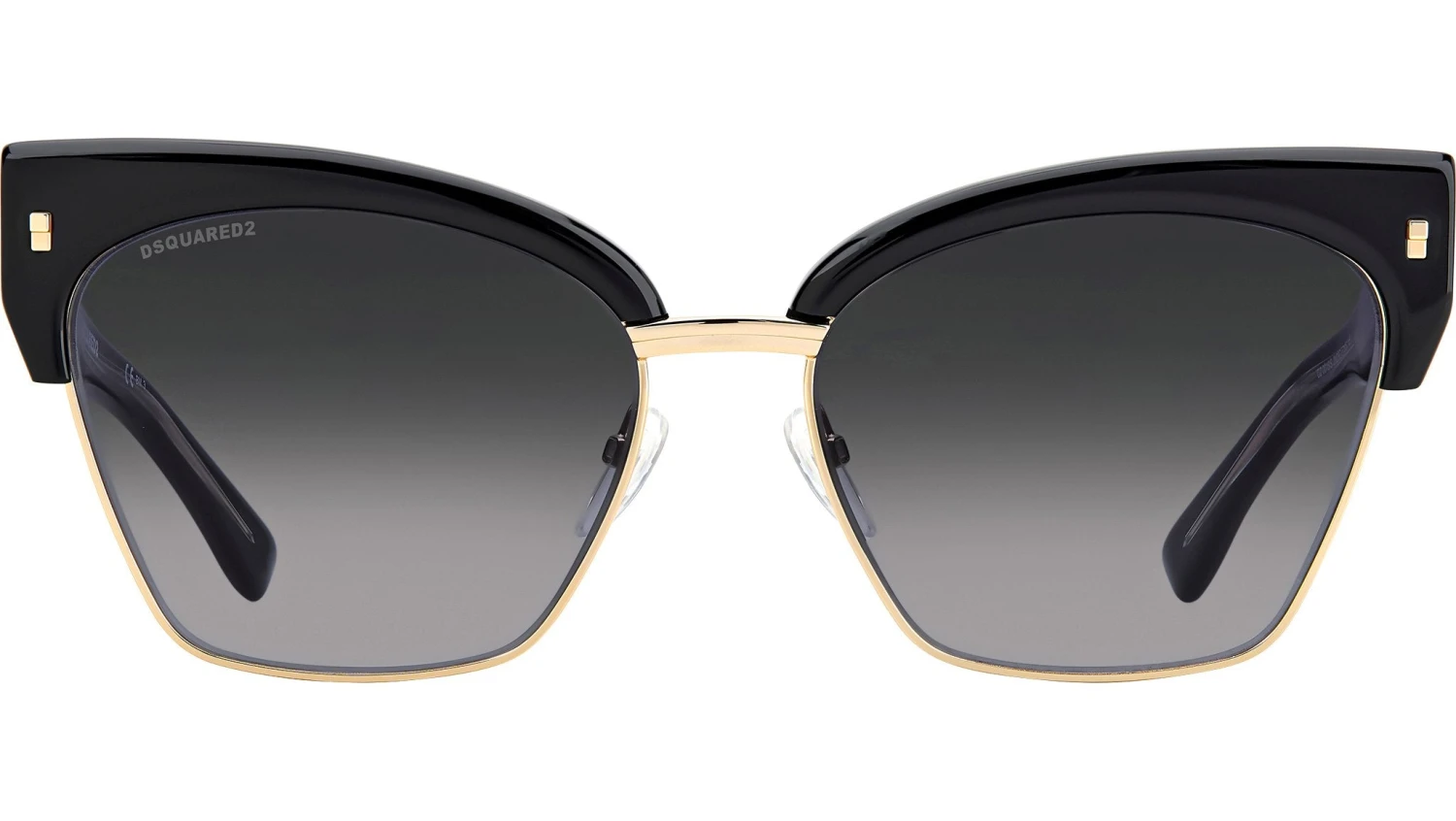 Dsquared2 D2 0015/S 2M2 9O sunglasses for women, featuring black gold cat eye metal frame and dark grey shaded lenses. These sunglasses are best described as vintage yet timeless: the uniquely-shaped contours are complemented by a galvanic Dsquared2 logo on the metal core, inspired by the labels used for the clothing line. The iconic metal rivets on the acetate frames, the sophisticated design of the front in metal with an acetate insert on the top bar, and the maple leaf detail on the end tips convey the spirit of these women’s glasses, made to embody the inimitable, unmistakable style of Dsquared2. Brand line: Refined. Style code: 204954. Color code: 2M2 9O. Authorized Dsquared2 online reseller. Your glasses will include the original case and accessories and are covered by a 12-month global warranty.