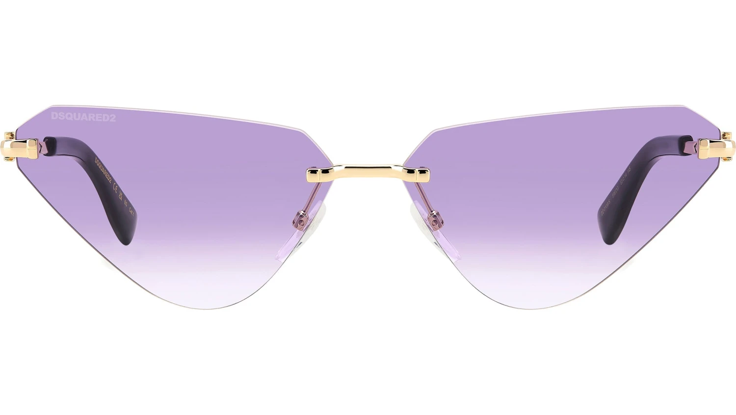 Dsquared2 sunglasses model D2 0108/S color code S9E gold violet. These DSQUARED2 sunglasses embody the style of women who are always one step ahead of the trends, with a rimless cat-eye shape and gradient lenses. The finely detailed bridge is an attention-worthy feature, resting on branded nose pads. The D2 logo trims the outside of the slender metal temples, the CERESIO 9, MILANO inscription decorates the inside, and the maple leaf is found on the acetate end tips. Authorised Dsquared2 Online Reseller. Your glasses will come including the original case and accessories and will be covered by 12 month global warranty.