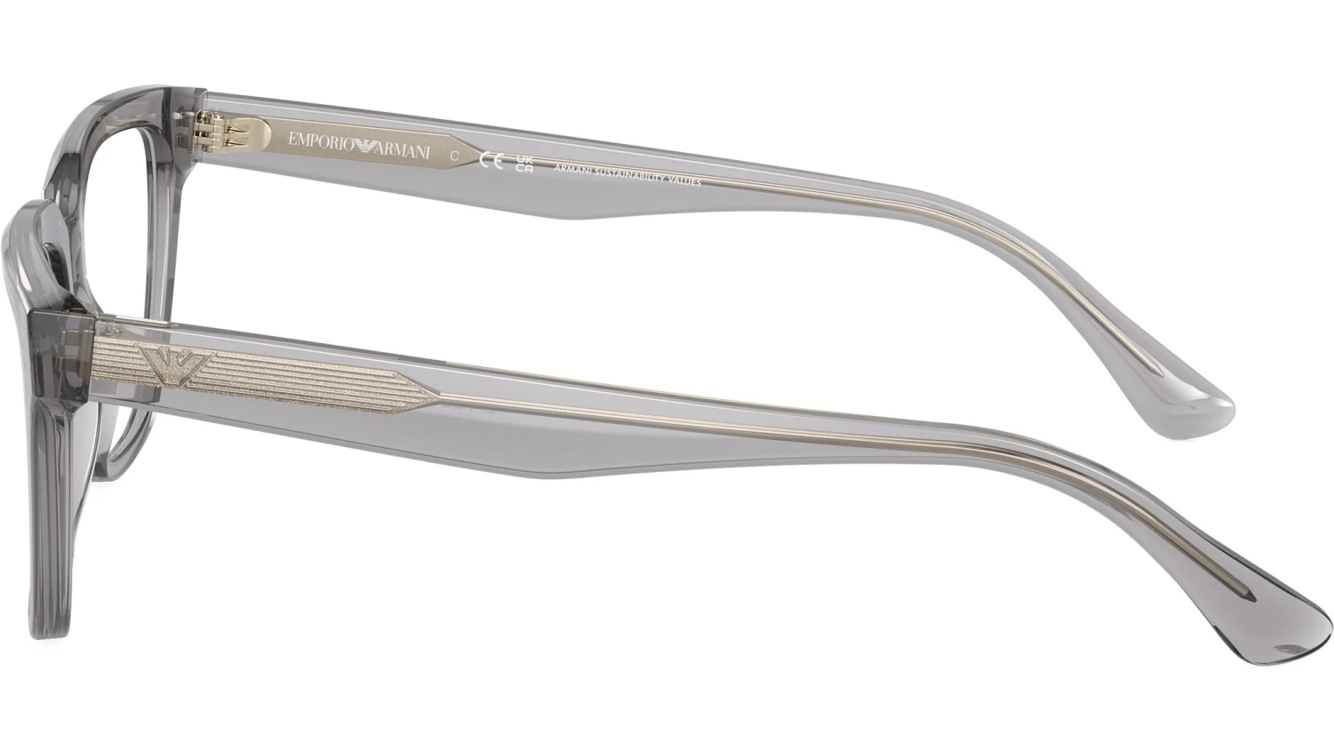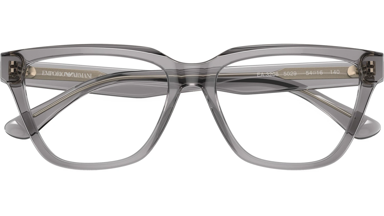 Emporio Armani eyeglasses for women model EA3208 featuring shiny transparent grey full rim acetate frame and base 4 curve demo lens. High Bridge Fit. Frame line: Runway. Brand code: EA3208. Color code: 5029. Authorised Emporio Armani Online Reseller. Your glasses will come including the original case and accessories and will be covered by 12 month global warranty.