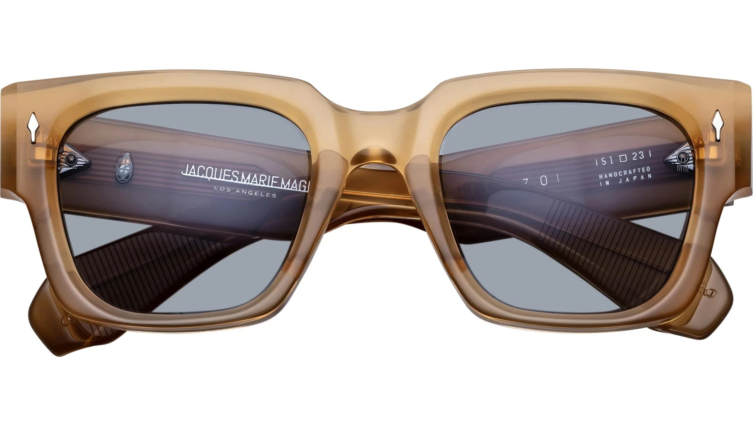 Jacques Marie Mage Enzo sunglasses are bold, boxy icons of the brand, featuring signature arrowhead front pins, spur-shaped rivets, custom 7-barrel hinges, and temple wirecores with refined hairline detailing. Designed as a tribute to legendary drivers and iconic automotive marques, these limited-edition frames embody a fusion of racing-inspired performance and elevated design, offering a striking and sophisticated silhouette for those with commanding presence.