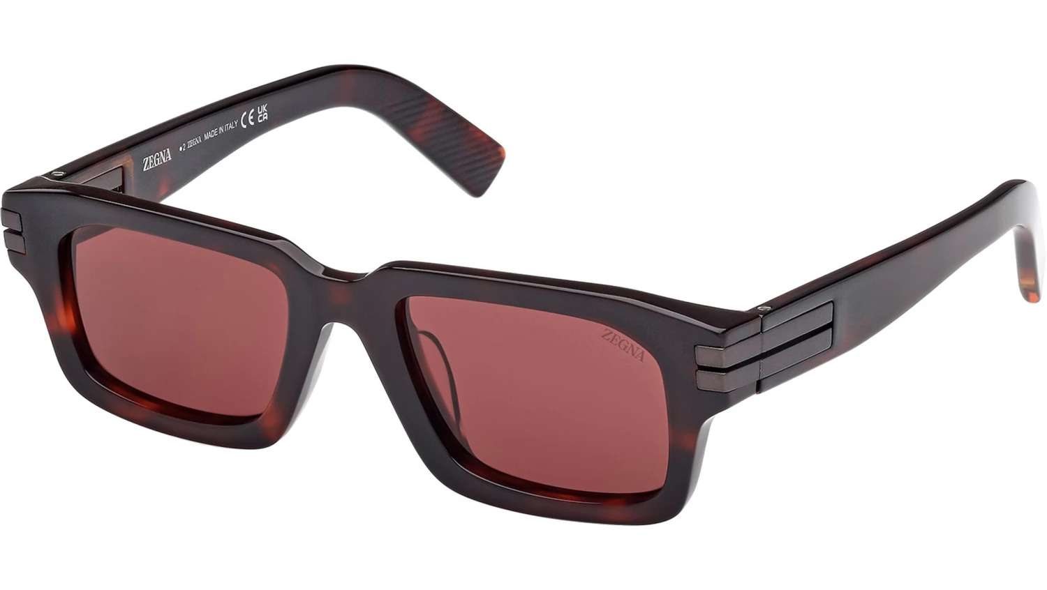 Zegna sunglasses for men model EZ0255 featuring red havana full-rim acetate frame and red lenses. Brand code: EZ0255. Color code: 54S. Authorised Ermenegildo Zegna Online Reseller. Your glasses will include the original case and accessories and will be covered by a 12-month global warranty.