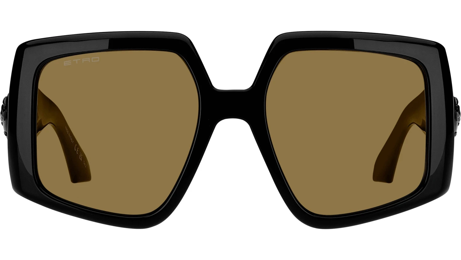 ETRO sunglasses model 0038/S color code 807 2M black. Square full rim injection frame for women with antireflection brown antireflex lens. These women’s sunglasses embody ETRO’s impactful elegance through eccentric shapes, heritage details and technical innovation. Making a bold statement with every wear, the frames feature an oversize geometric square shape, paired with the range’s distinctive triangular temples. The emblematic 3D Pegaso logo on the temple conceals an integrated hinge, engineered without metal parts: a cutting-edge technical detail that seamlessly blends functionality with aesthetics. Signature elements reflect the brand’s meticulous craftsmanship – note the iconic end tips, designed to recreate the symmetry of the ETRO logo, and the lasered “ETRO” lettering on the tinted lens. Authorised ETRO Eyewear Online Reseller. Your glasses will come including the original case and accessories and will be covered by 12 month global warranty.