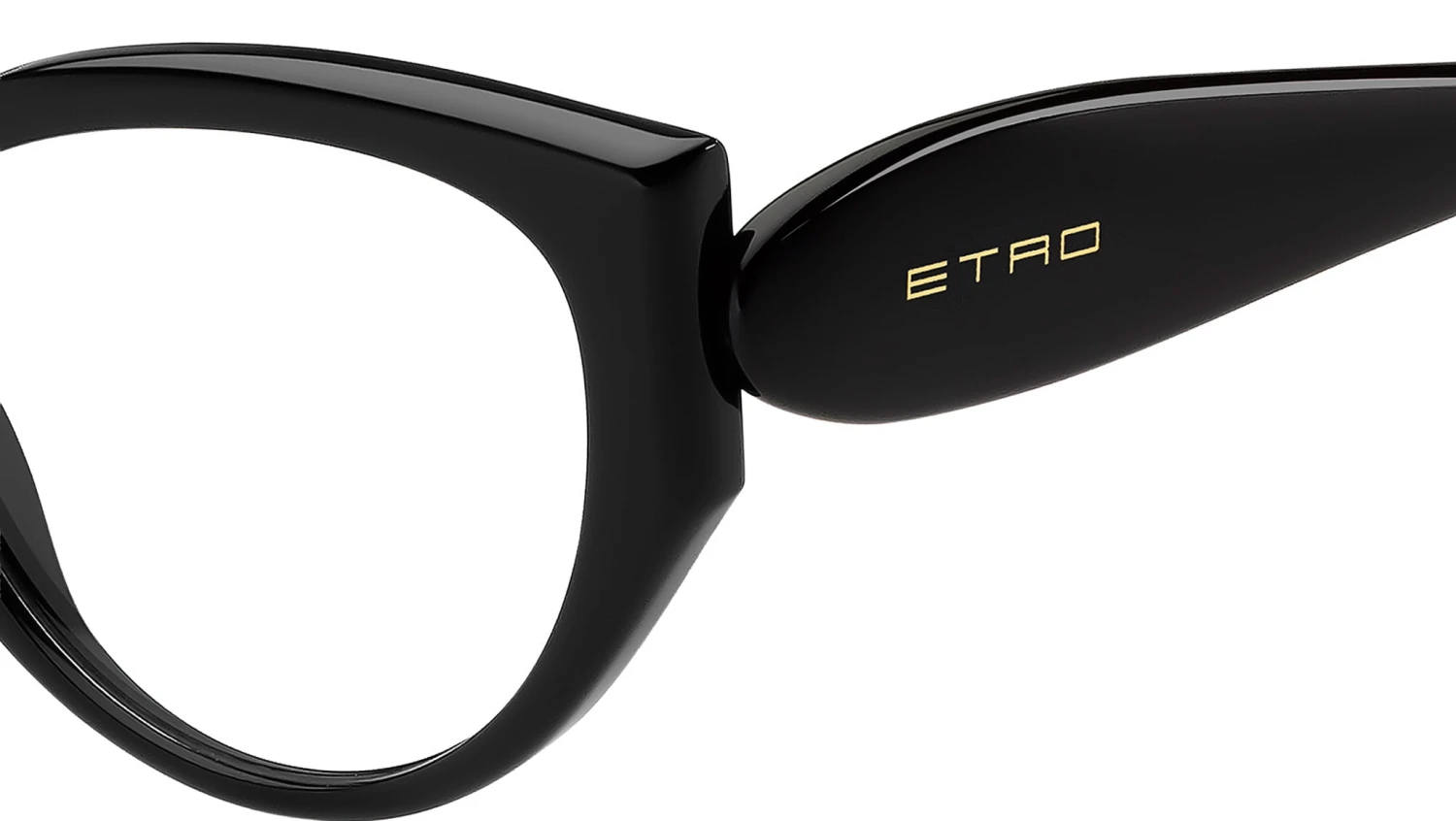 Etro 0057 807 glasses for women, featuring black cat eye acetate frame and demo lenses. The “Etropaisley” eyewear line breathes new life into the timeless pattern. These optical glasses embody playful decadence with their geometric angles and strong acetate shapes, offered in a sophisticated colour palette. Seemingly simple from the front, this frame stands out with its unique temples – designed to resemble the iconic Paisley shape. The brand’s minimalist logos on each side add a subtle yet stylish detail. Brand line: Etromania. Style code: 108773. Color code: 807. Authorized Etro online reseller. Your glsses will include the original case and accessories and are covered by a 12-month global warranty.
