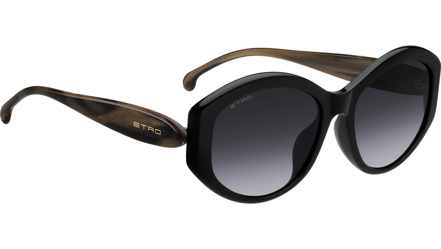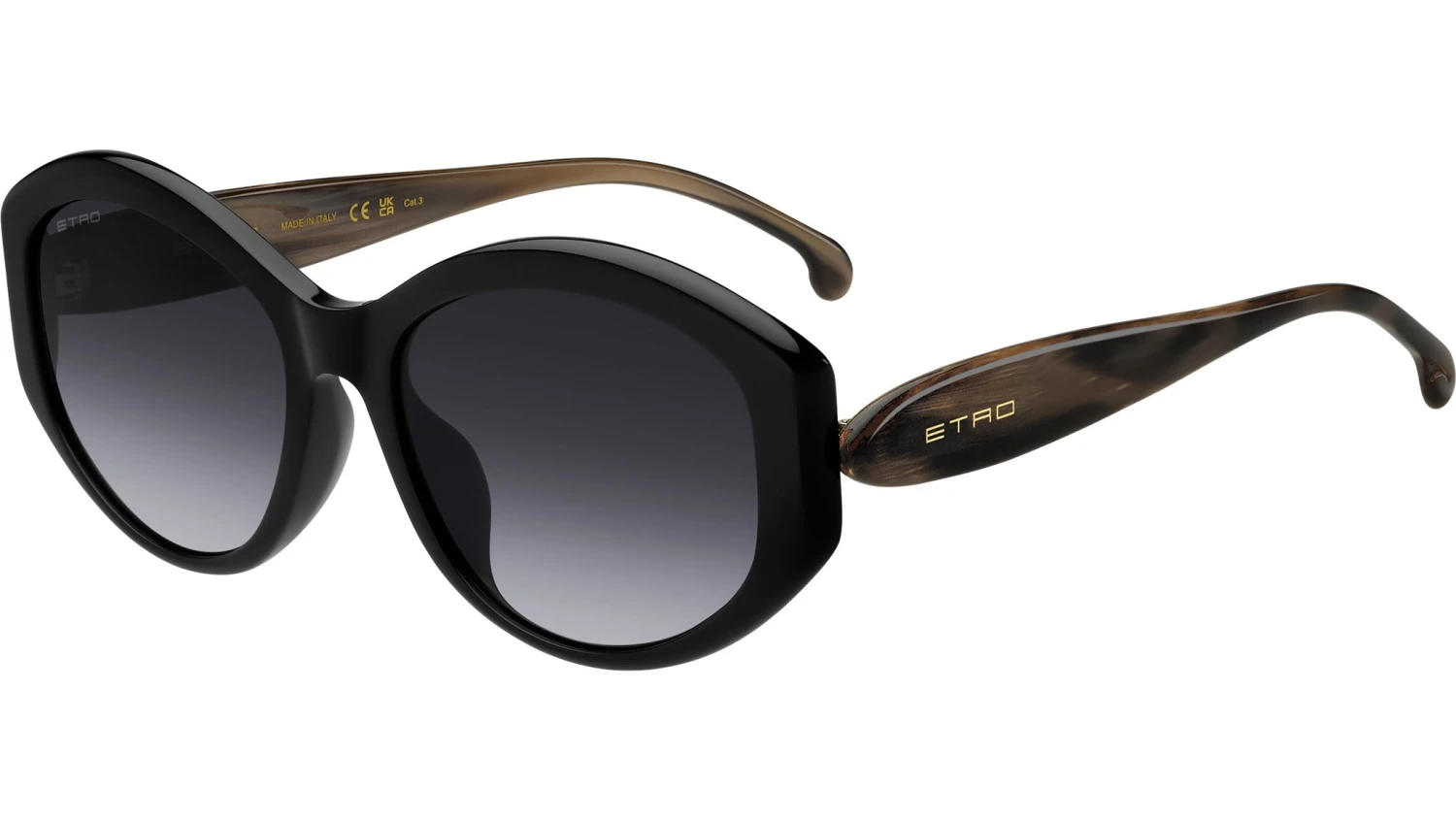 Etro 0086/F/S 807 9O sunglasses for women, featuring black oval acetate frame and dark grey shaded lenses. The epitome of the ETRO spirit, the “Etropaisley” eyewear line celebrates the brand’s unmistakable motif in all its forms and chromatic variations. These sunglasses are reminiscent of a work of art with their softly curved geometric frame and custom wavy temples resembling the iconic Paisley shape. With an emphasis on delicate proportions and daring colourways, including irresistible two-tone variations, each style is accented with the ETRO logo and the brand’s signature tips featuring the rounded geometry of the Paisley motif. Brand line: Etromania. Style code: 207826. Color code: 807 9O. Authorized Etro online reseller. Your glasses will include the original case and accessories and are covered by a 12-month global warranty.