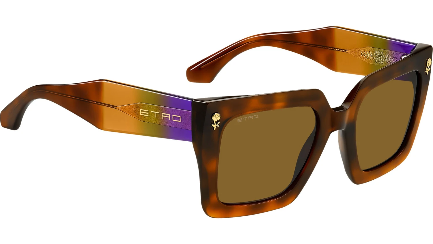 Etro 0089/S C9B 70 sunglasses for women, featuring havana honey squared acetate frame and brown lenses. Evolving ETRO’s “Colour Stripes” story for the new season, these sunglasses are designed to be seen. The bold acetate frame is bevelled around the front for lightness and paired with geometric temples in a sheer ombré palette that allows the graphic metal wirecore to peek through. Notice the floral details inspired by intricate embroidery techniques, the famous ETRO logo and the signature temple tips. The colour palette blends classic tones with intriguing transparencies to striking effect. Brand line: Etromania. Style code: 207783. Color code: C9B 70. Authorized Etro online reseller. Your glasses will include the original case and accessories and are covered by a 12-month global warranty.