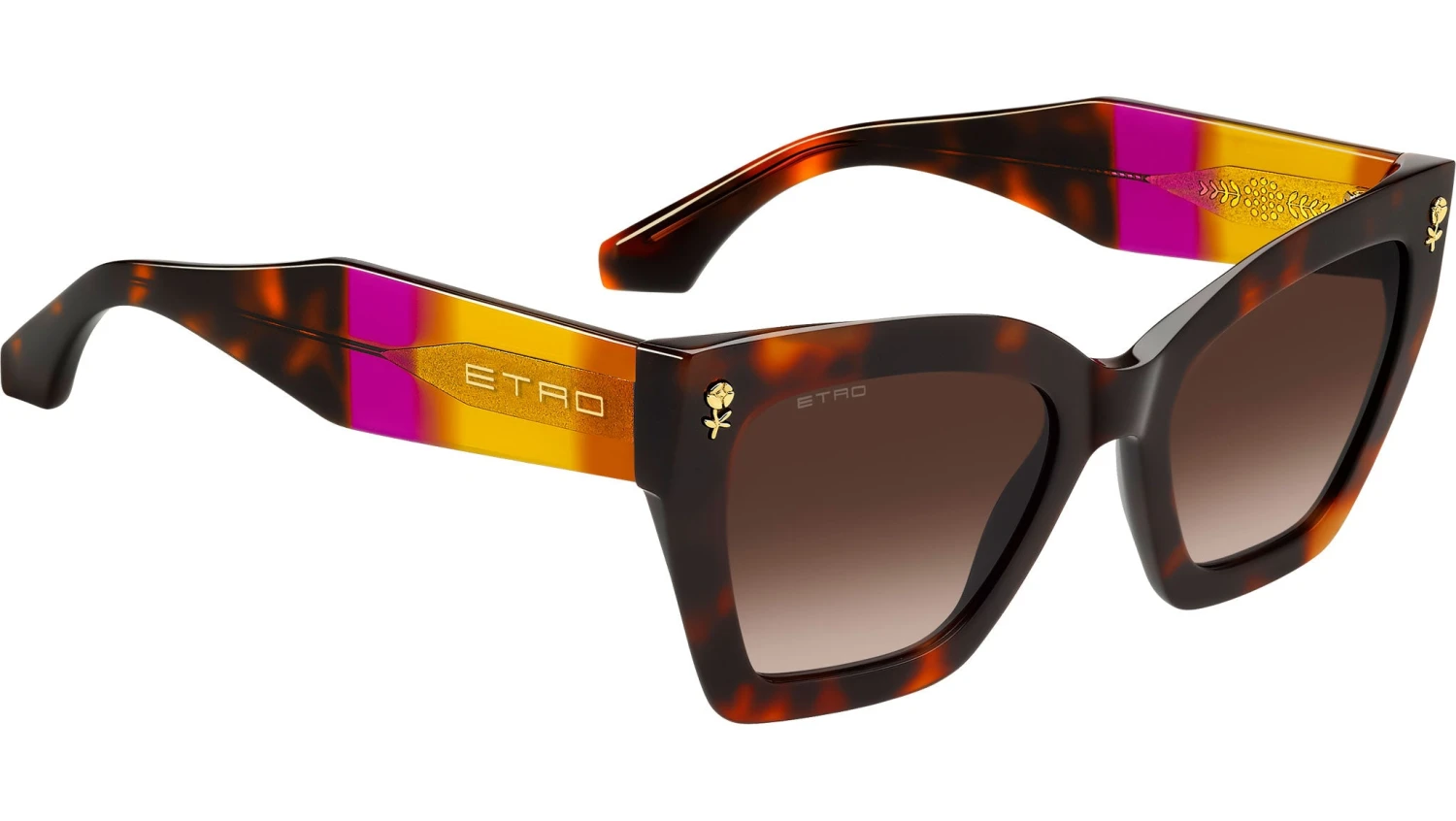 Etro 0090/S 086 HA sunglasses for women, featuring havana rectangular acetate frame and brown shaded lenses. Evolving ETRO’s “Colour Stripes” story for the new season, these sunglasses are designed to be seen. The bold acetate frame is bevelled around the front for lightness and paired with geometric temples in a sheer ombré palette that allows the graphic metal wirecore to peek through. Notice the floral details inspired by intricate embroidery techniques, the famous ETRO logo and the signature temple tips. The colour palette blends classic tones with intriguing transparencies to striking effect. Brand line: Etromania. Style code: 207784. Color code: 086 HA. Authorized Etro online reseller. Your glasses will include the original case and accessories and are covered by a 12-month global warranty.
