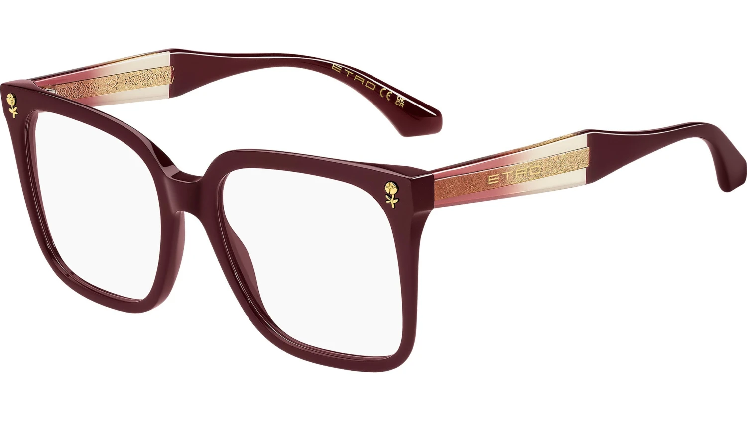 Etro 0093 LHF glasses for women, featuring burgundy squared acetate frame and demo lenses. Evolving ETRO’s “Colour Stripes” story for the new season, these optical glasses are designed to be seen. The bold acetate frame is bevelled around the front for lightness and paired with geometric temples, exquisitely detailed with a graphic metal wirecore. Notice the floral details inspired by intricate embroidery techniques, the famous ETRO logo and the signature temple tips. The colour palette blends classic tones with intriguing transparencies to striking effect. Brand line: Etromania. Style code: 109297. Color code: LHF. Authorized Etro online reseller. Your glsses will include the original case and accessories and are covered by a 12-month global warranty.