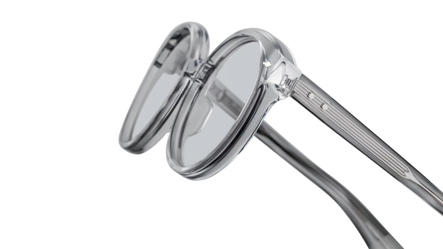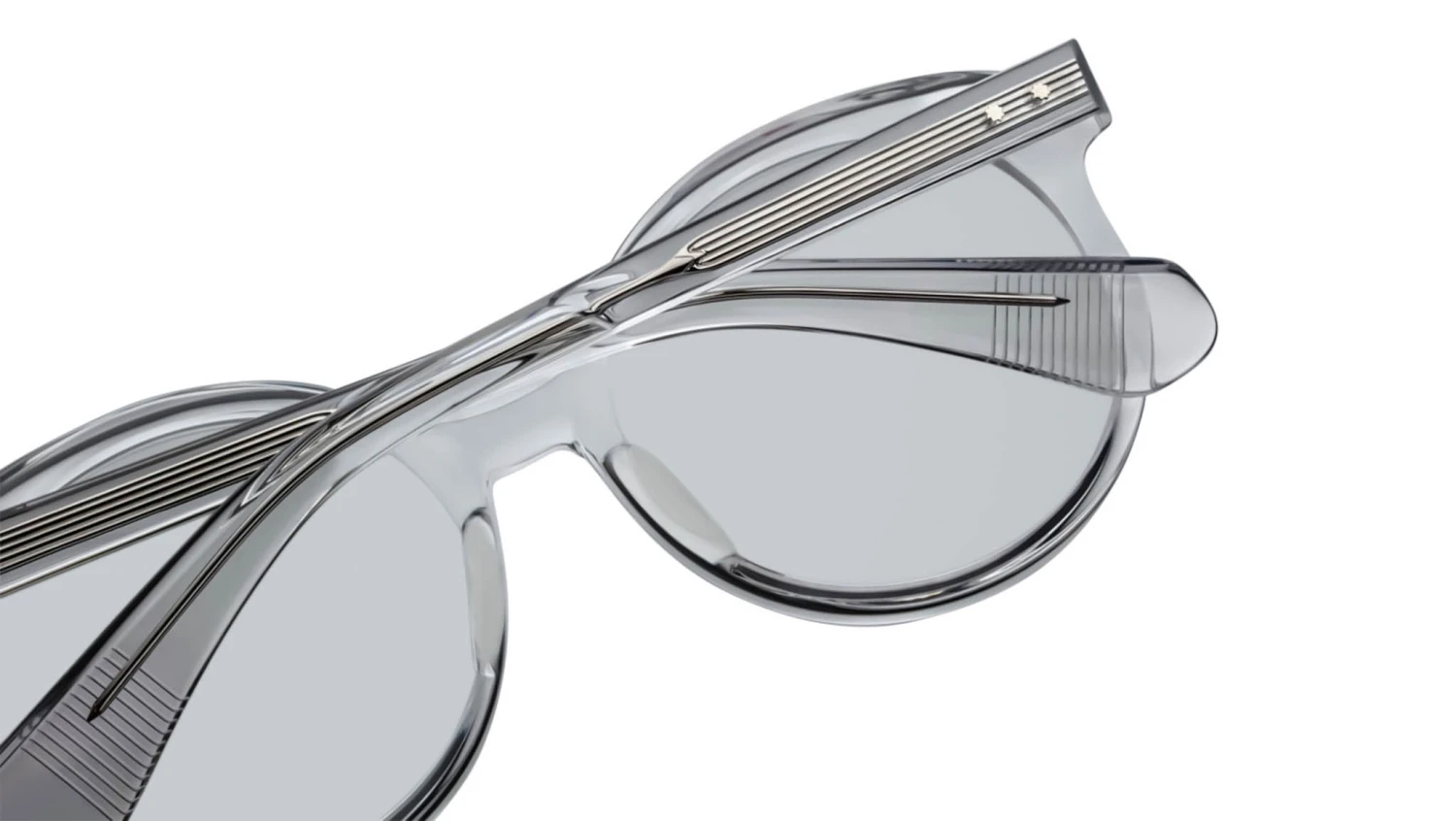 Grey 10mm cured cellulose acetate frame with double laminated acetate temples, highlighted by sterling silver signature arrowhead front pins and an exposed silver classic wirecore. Features a silver tension-secured 5-barrel hairline hinge and dove CR-39 4 base lenses with backside anti-reflective treatment. Offers 100% UV protection.