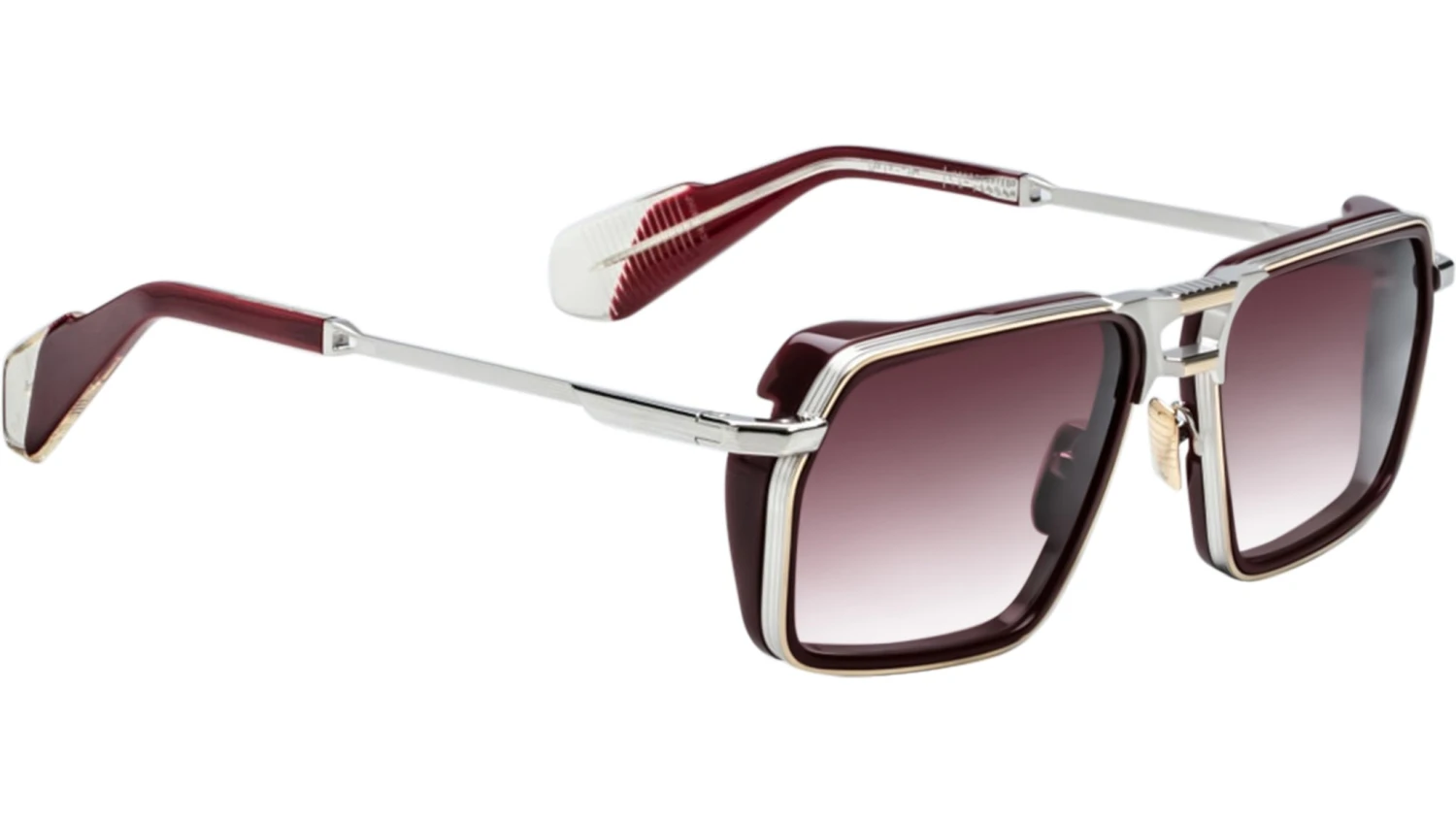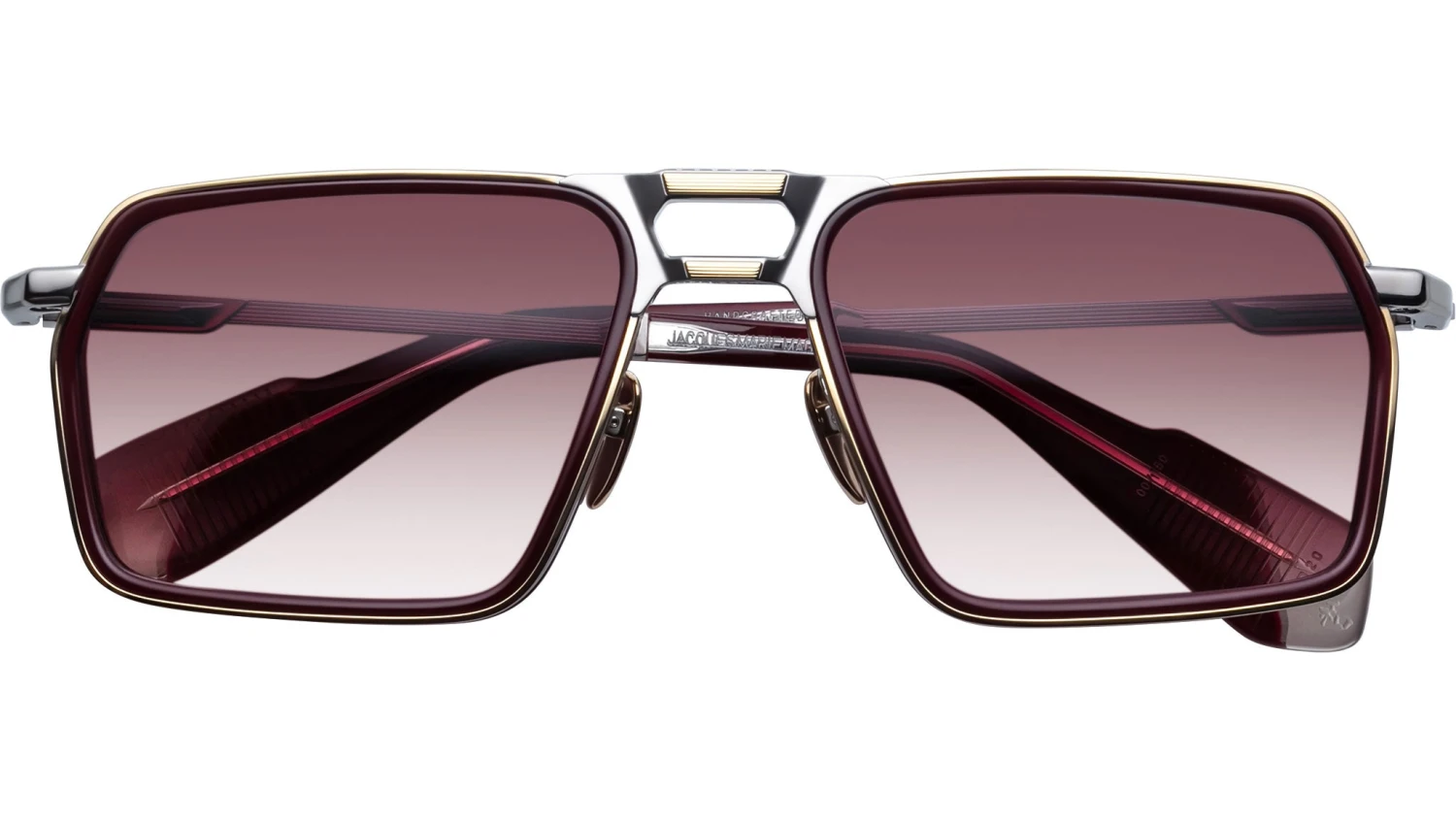 Silver 100% beta titanium frame with 11mm burgundy cured cellulose acetate inserts and burgundy gradient lenses. Silver hairline-engraved titanium temples with acetate tips. Silver tension-secured custom 917 hinge. Burgundy acetate eyerim insert. Custom nose pads with logo and hairline engraving. Reserve CR-39 4-base lenses with backside anti-reflective treatment. 100% UV protection.