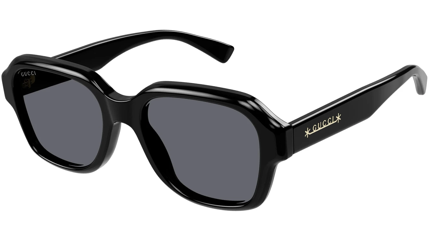 Gucci Logo sunglasses model GG1174S rectangle acetate frame color code 001 shiny solid black with black temple and solid smoke lens.