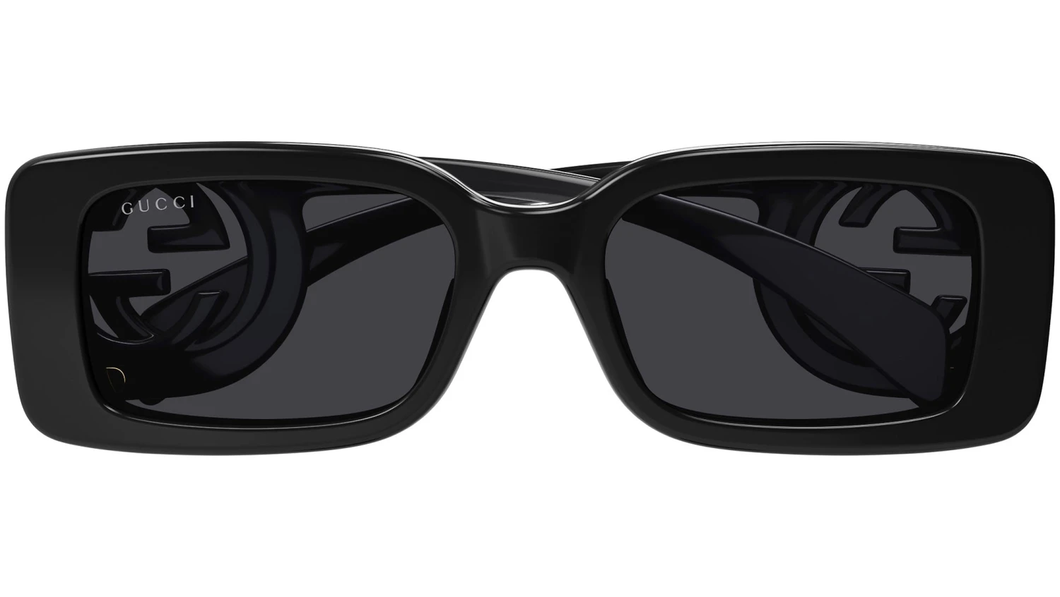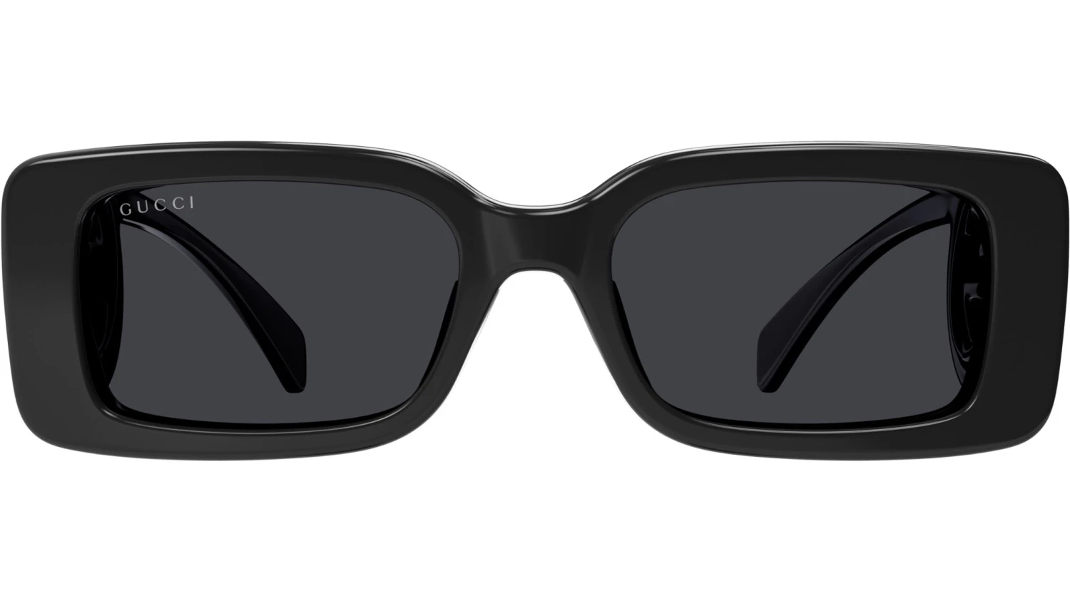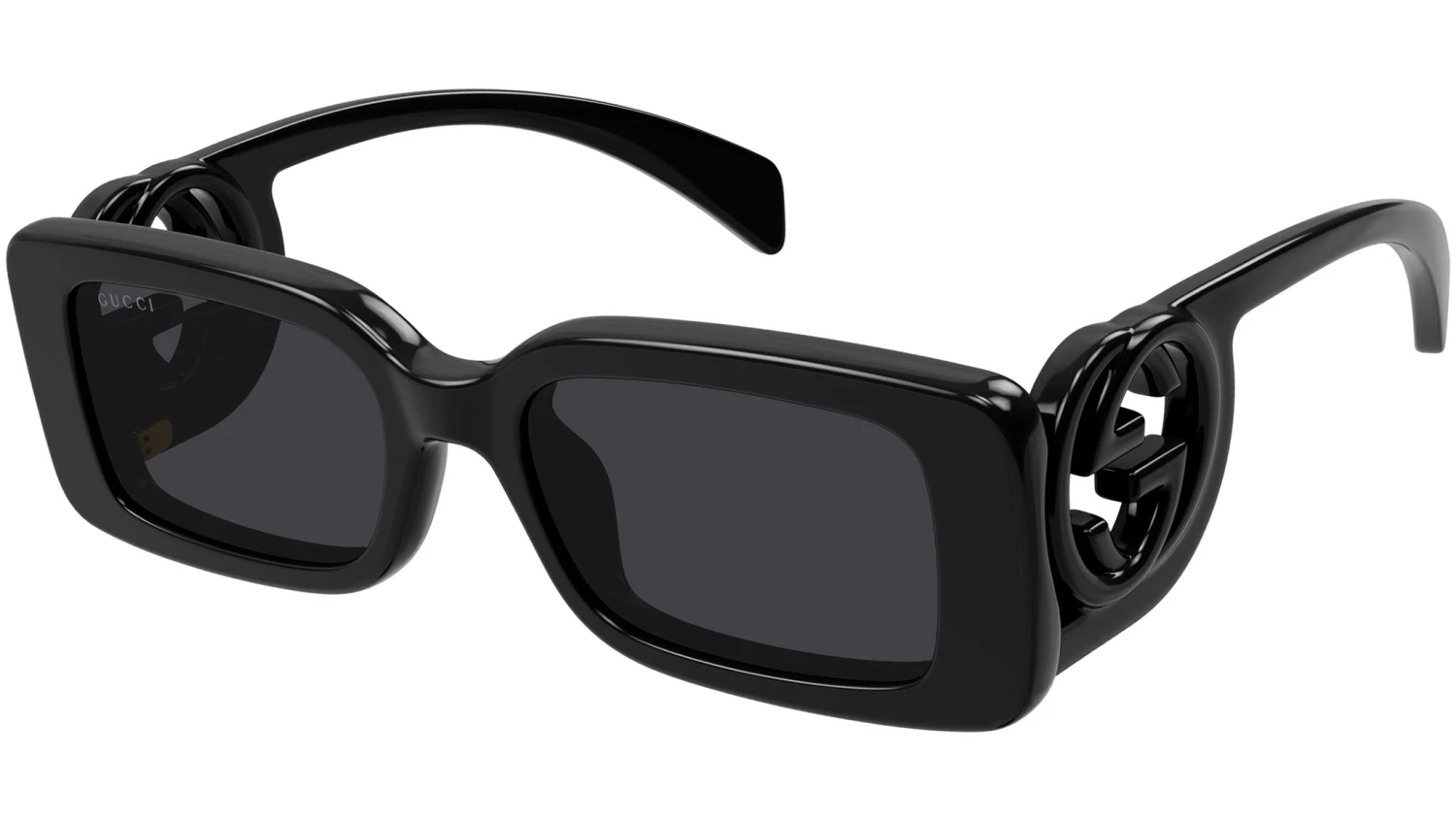 Gucci Gg Logo sunglasses model GG1325S rectangle injection frame color code 001 shiny black with black temple and solid grey lens.
