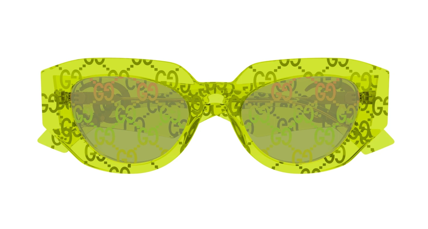 Gucci GG1421S 007 sunglasses for women, featuring shiny bilayer Guccissima crystal / transparent vivid green geometric recycled acetate frame and solid green + iris classic mirror Guccissima logo bio nylon lenses. Brand line: Emblem. Style code: GG1421S. Color code: 007. Made in Italy. Authorized Gucci online reseller. Your glasses will include the original case and accessories and are covered by a 12-month global warranty.