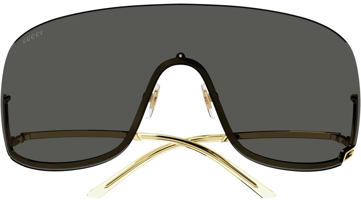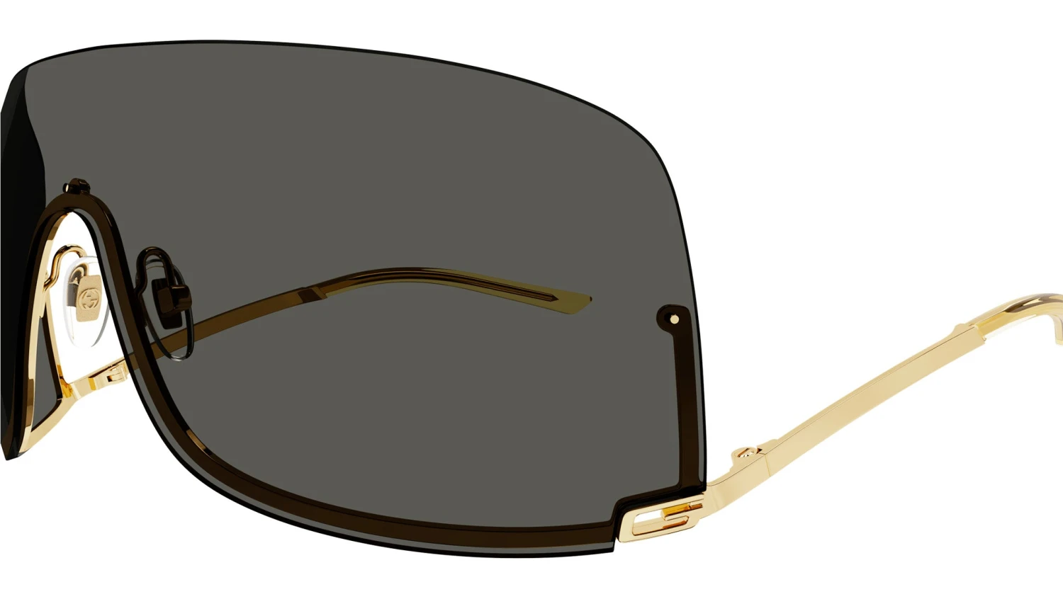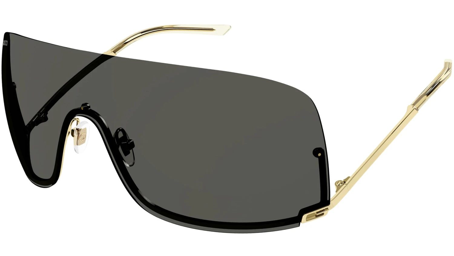 Gucci Fashion sunglasses model GG1560S shield metal frame color code 001 shiny endura gold with gold temple and solid grey lens.