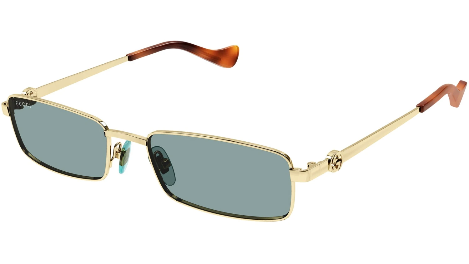 Gucci GG Logo sunglasses model GG1600S rectangle metal frame color code 003 shiny endura gold with gold temple and solid light green lens.