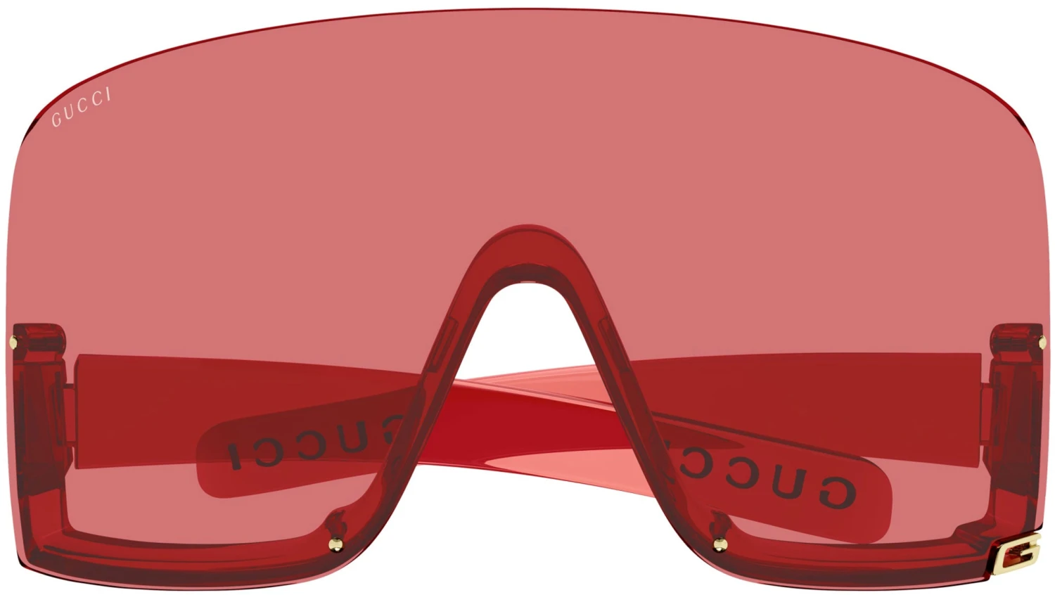 Gucci sunglasses model GG1631S Fashion eyewear collection shield injection frame featuring shiny transparent red frame and red lens.