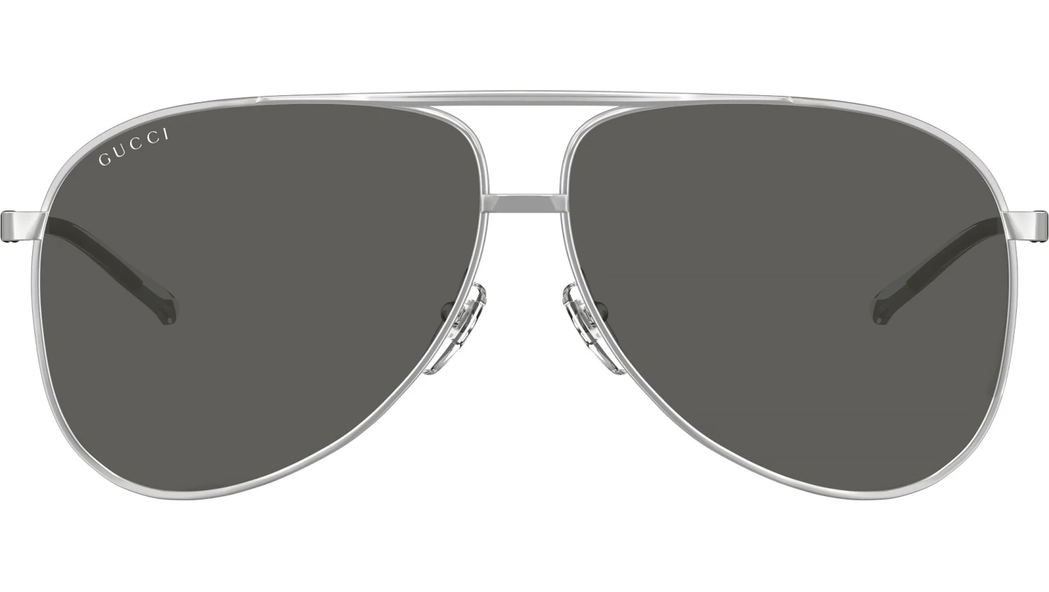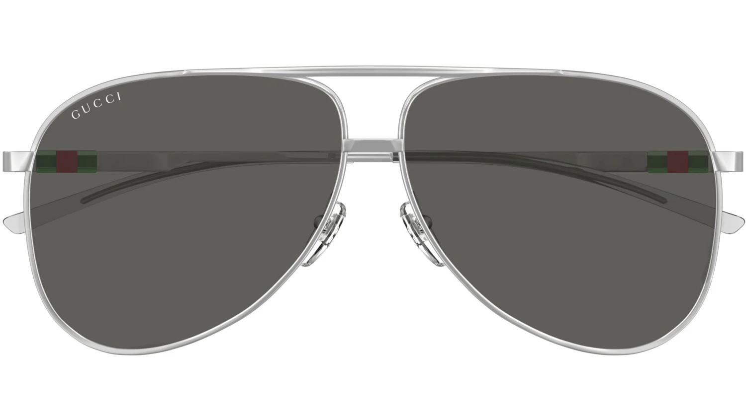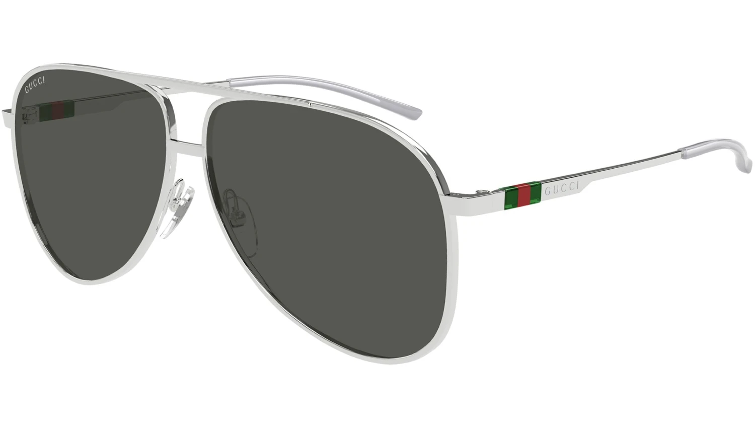 Gucci sunglasses model GG1677S Web line aviator metal frame color code 001 shiny silver with silver temple and solid grey lenses. Authorized Gucci online reseller. Your glasses will come with the original case and accessories and will be covered by a 12-month global warranty.