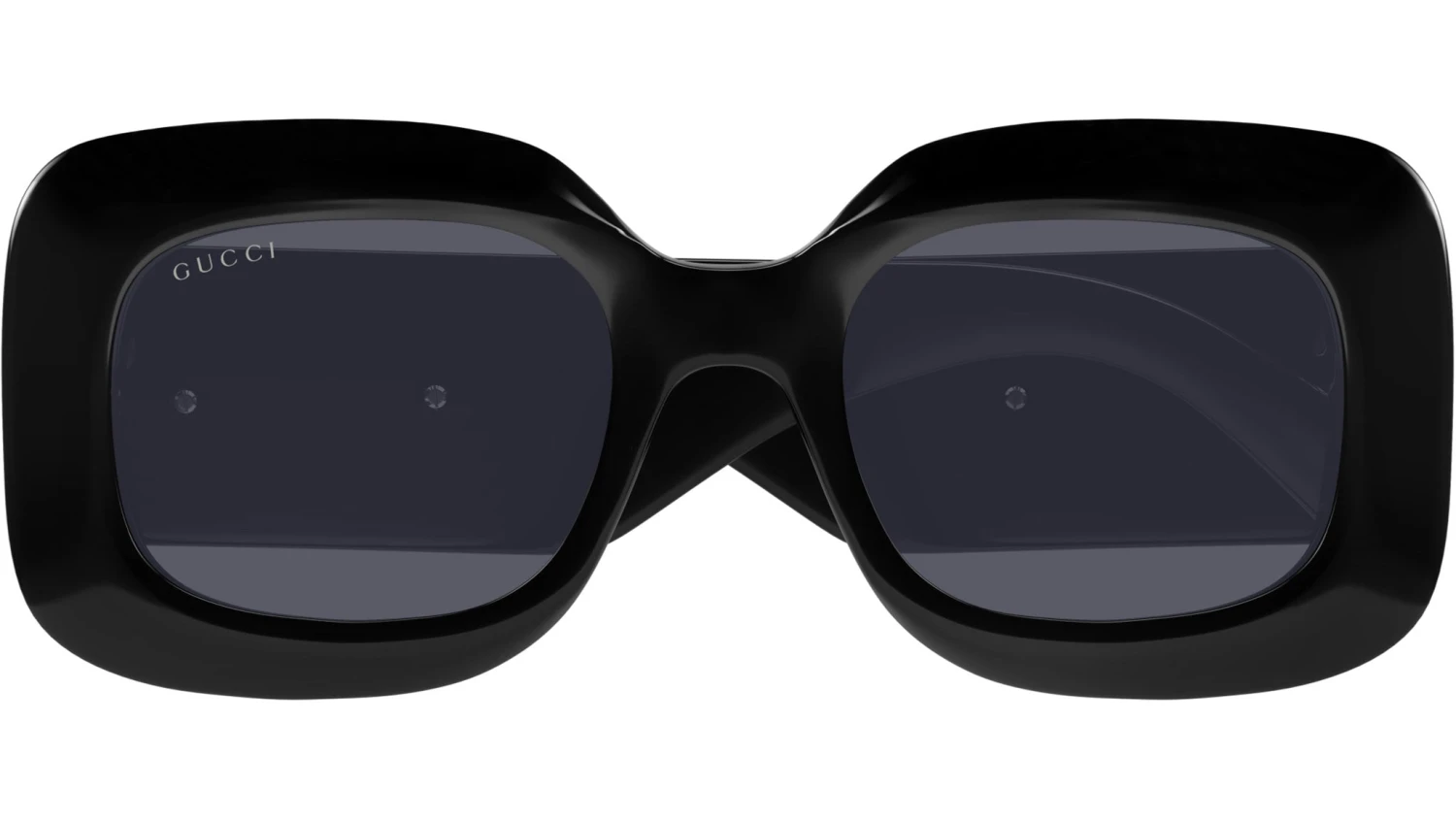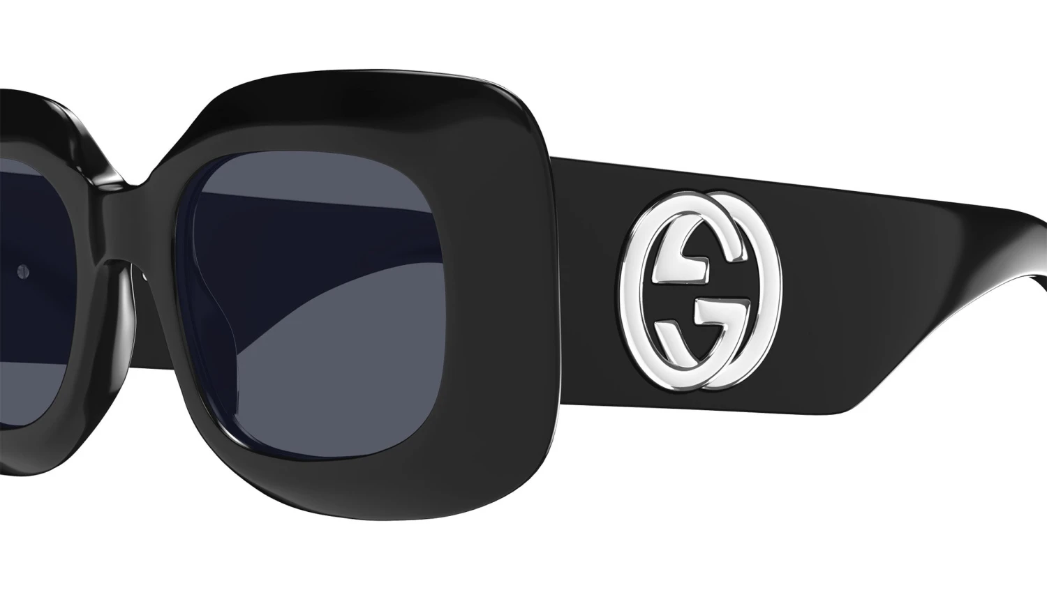Gucci sunglasses model GG1695S GG Logo line rectangle recycled acetate frame color code 001 shiny black with black temple and solid grey lenses. Authorized Gucci online reseller. Your glasses will come with the original case and accessories and will be covered by a 12-month global warranty.