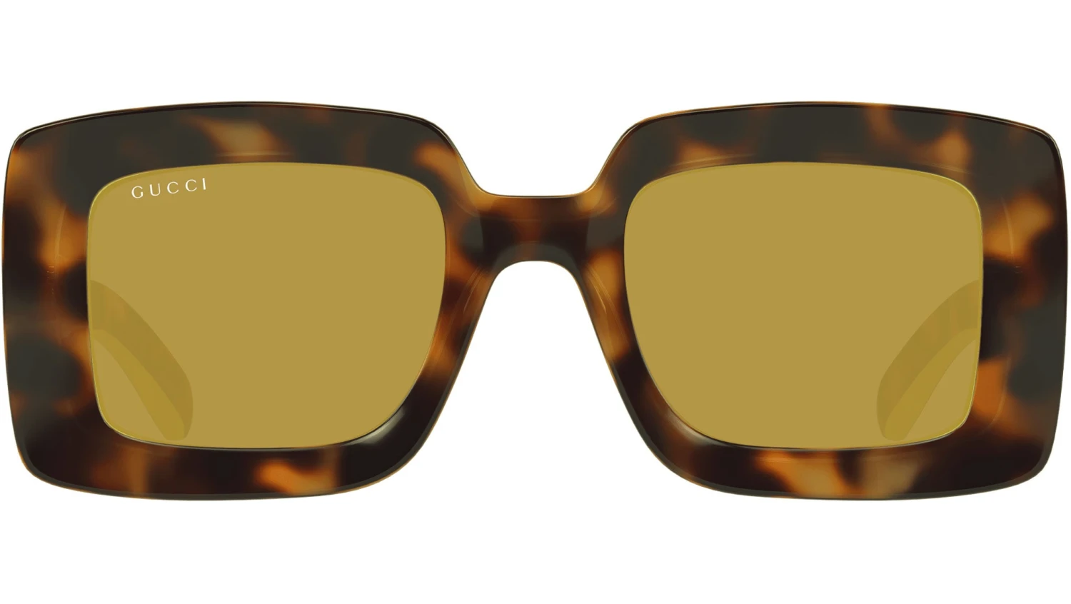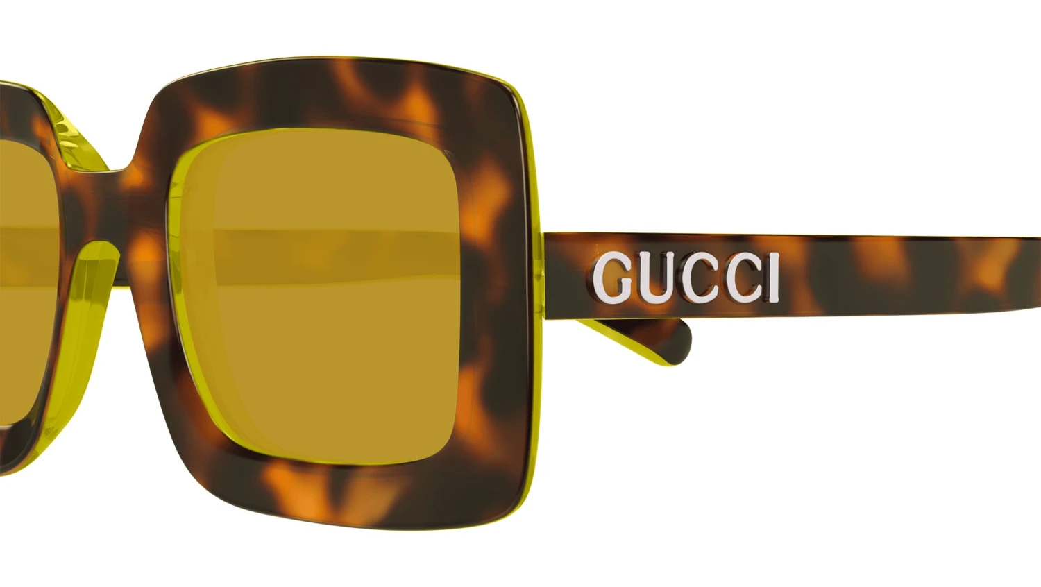 Gucci sunglasses model GG1718S Lettering line rectangle injection frame color code 002 shiny spotted havana + yellow with havana temple and solid nicotine lenses. Authorized Gucci online reseller. Your glasses will come with the original case and accessories and will be covered by a 12-month global warranty.