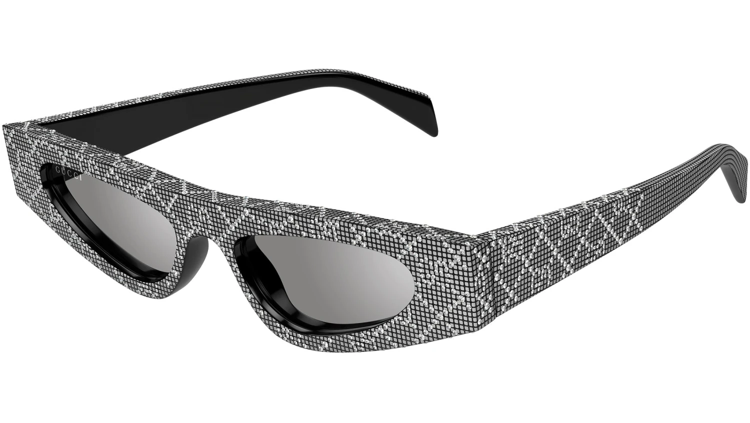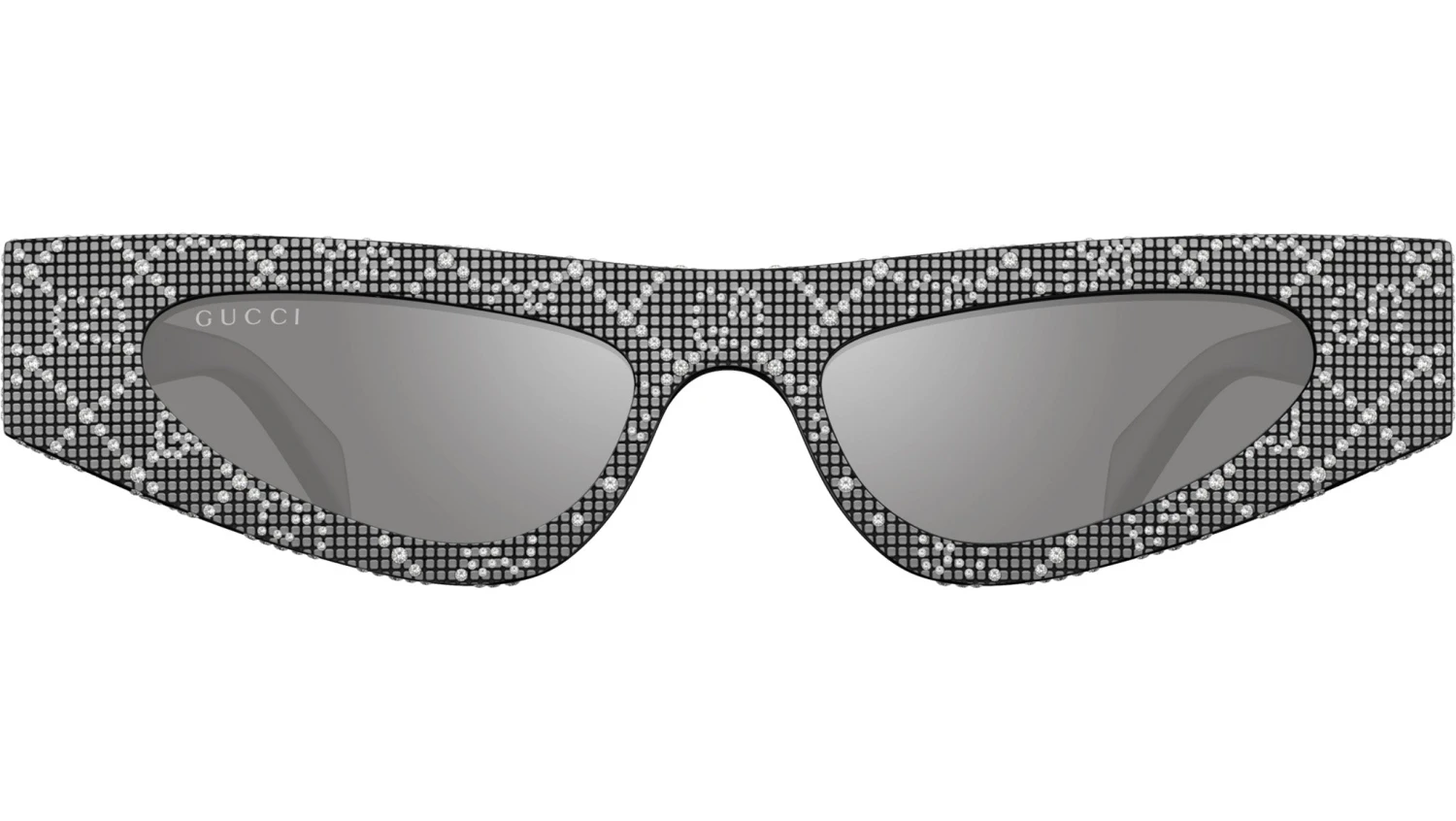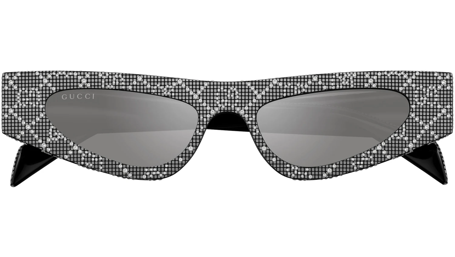 Gucci sunglasses model GG1779S Fashion line cat eye recycled acetate frame color code 009 shiny black with crystal strass all over and shiny silver color with black temple and solid grey + super strong silver lenses. Authorized Gucci online reseller. Your glasses will come with the original case and accessories and will be covered by a 12-month global warranty.