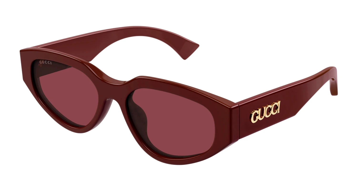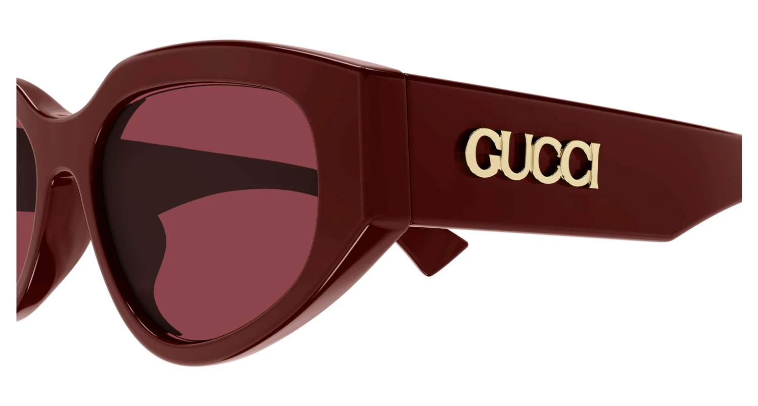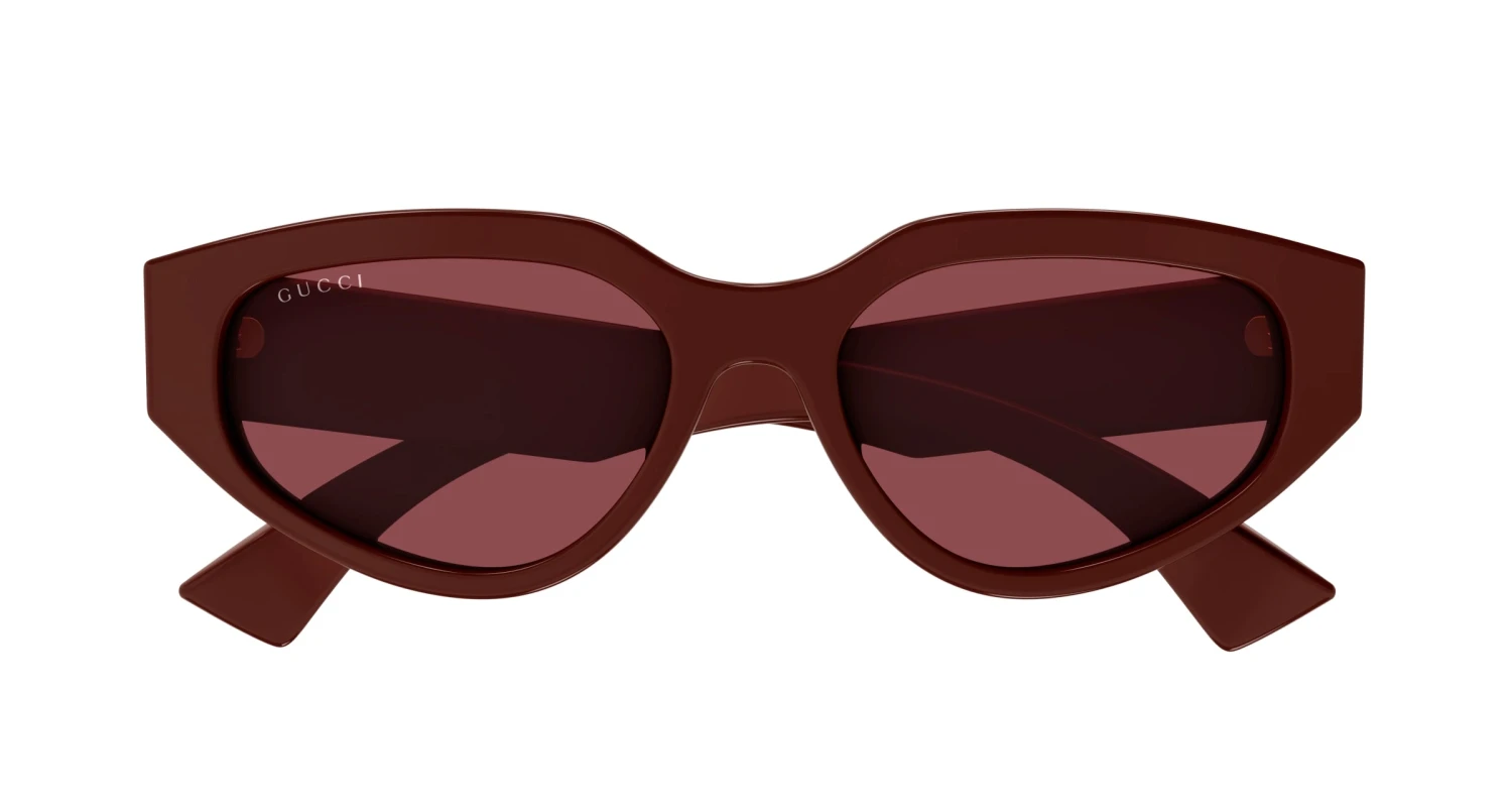 Gucci GG1845SA 003 sunglasses for women, featuring shiny solid burgundy cat eye recycled acetate frame and solid burgundy bio nylon lenses. Brand line: Name of Brand. Style code: GG1845SA. Color code: 003. Made in Italy. Authorized Gucci online reseller. Your glasses will include the original case and accessories and are covered by a 12-month global warranty.
