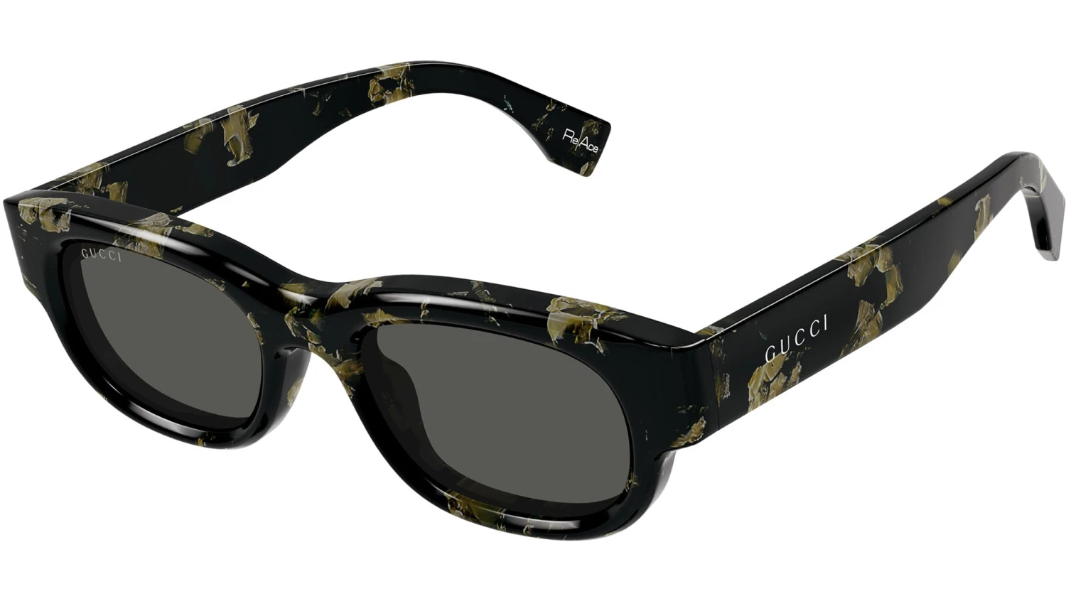 Gucci GG1910S 001 sunglasses for men, featuring shiny solid black with precious spotlight reace rectangular recycled acetate frame and solid grey bio nylon lenses. Brand line: Lettering. Style code: GG1910S. Color code: 001. Made in Italy. Authorized Gucci online reseller. Your glasses will include the original case and accessories and are covered by a 12-month global warranty.