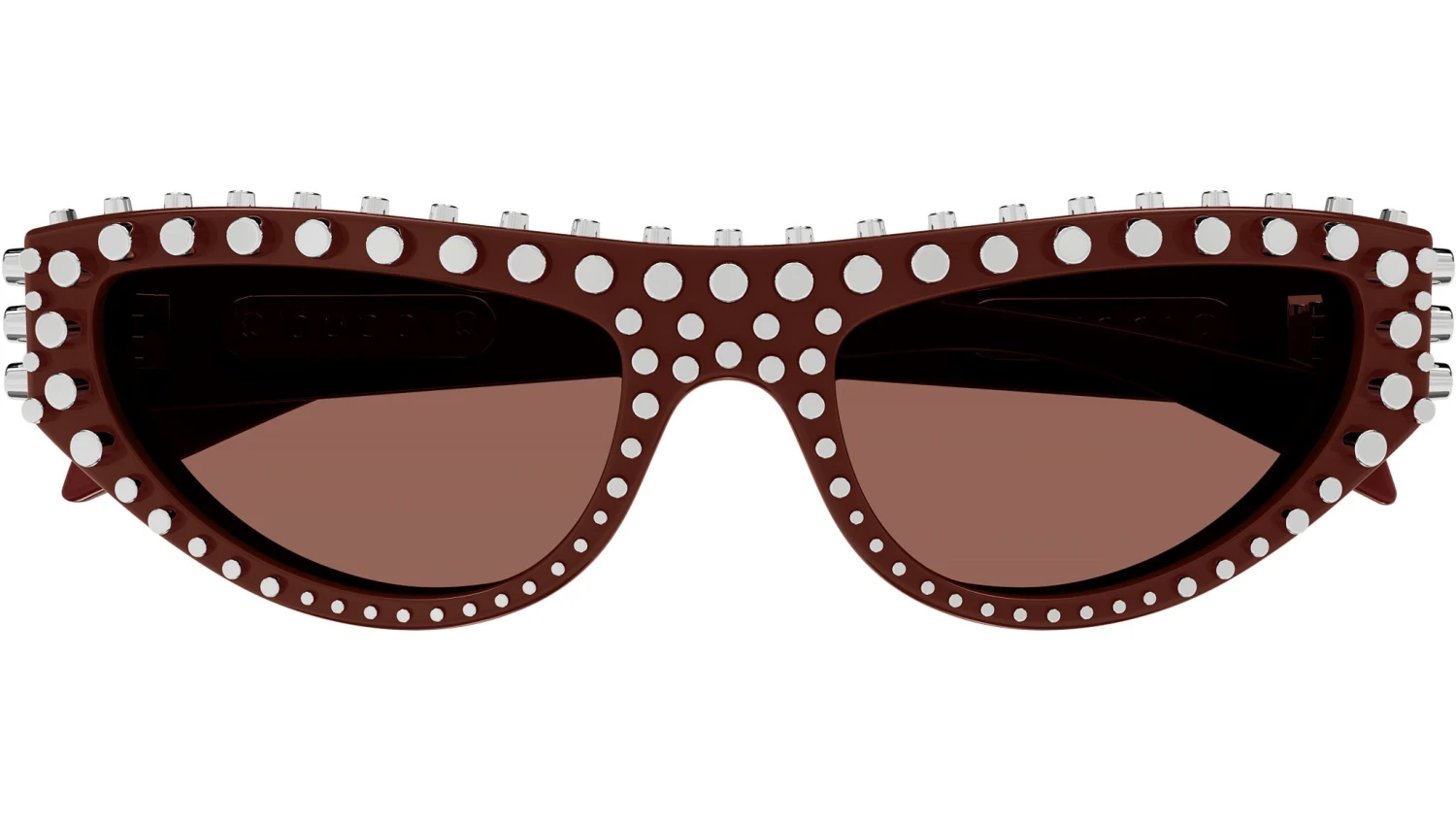 Gucci GG1919S 009 sunglasses for women, featuring shiny solid burgundy with studs on front cat eye recycled acetate frame and solid warm brown bio nylon lenses. Brand line: Eyewear. Style code: GG1919S. Color code: 009. Made in Japan. Authorized Gucci online reseller. Your glasses will include the original case and accessories and are covered by a 12-month global warranty.