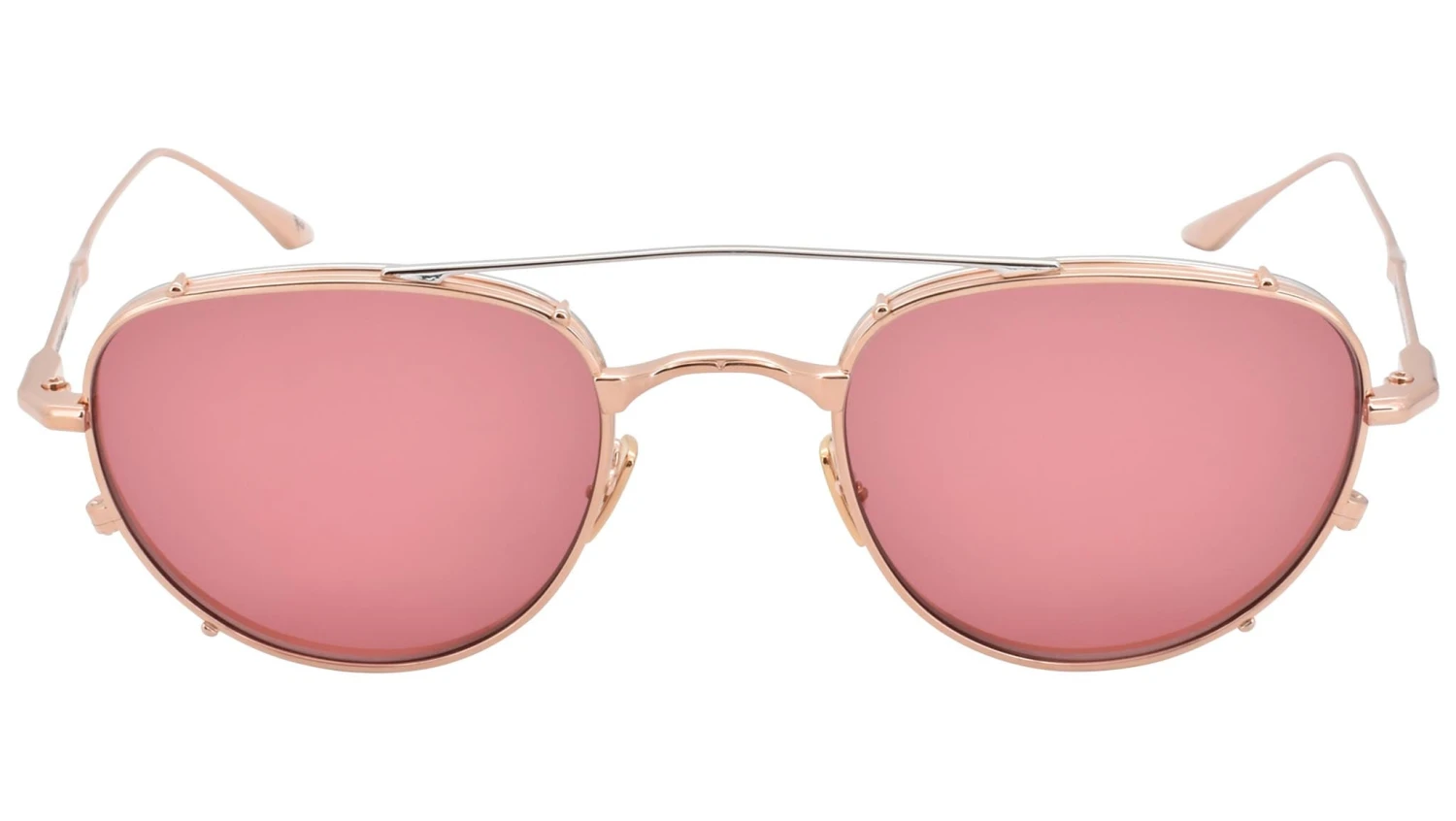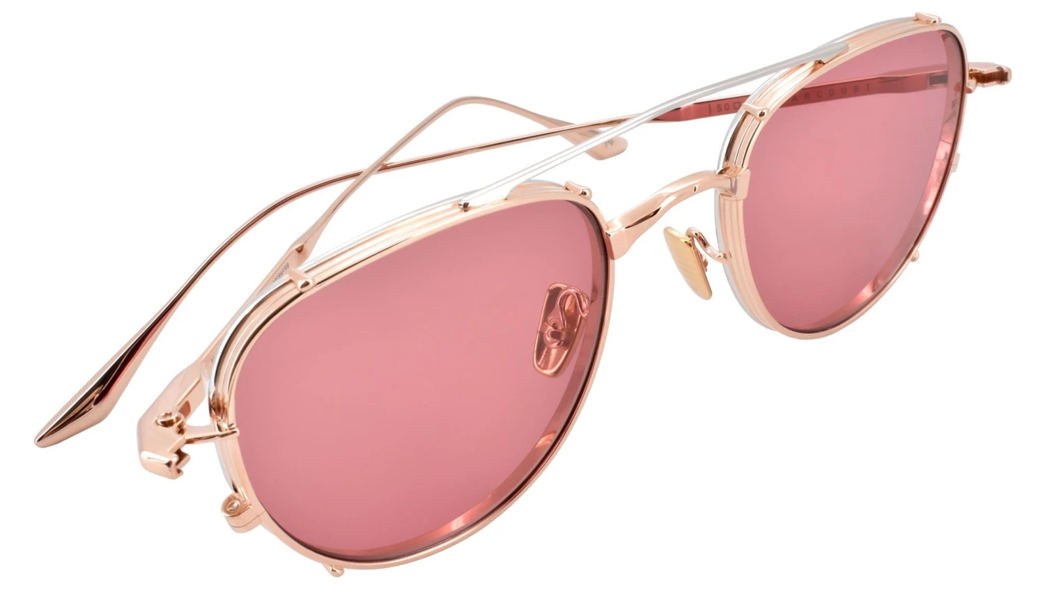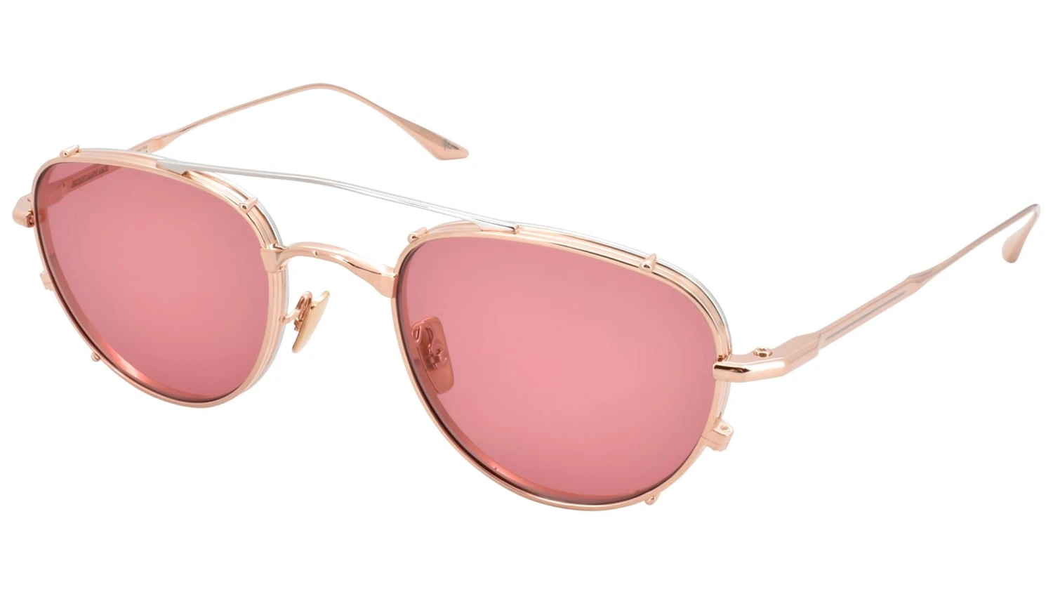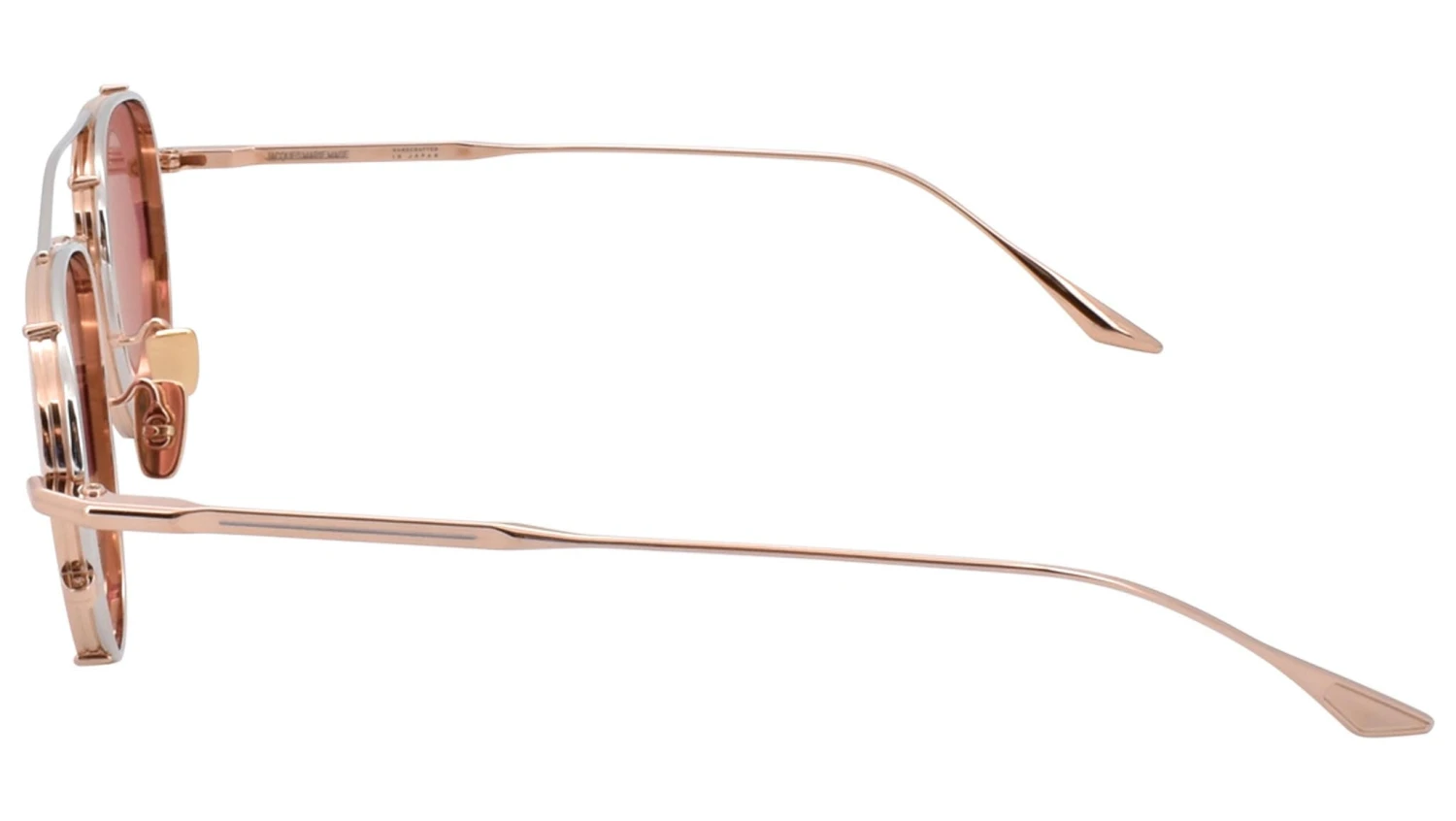 Material: 100% beta titanium rose gold and silver frame. Hardware: beta titanium. Lens: rose.
