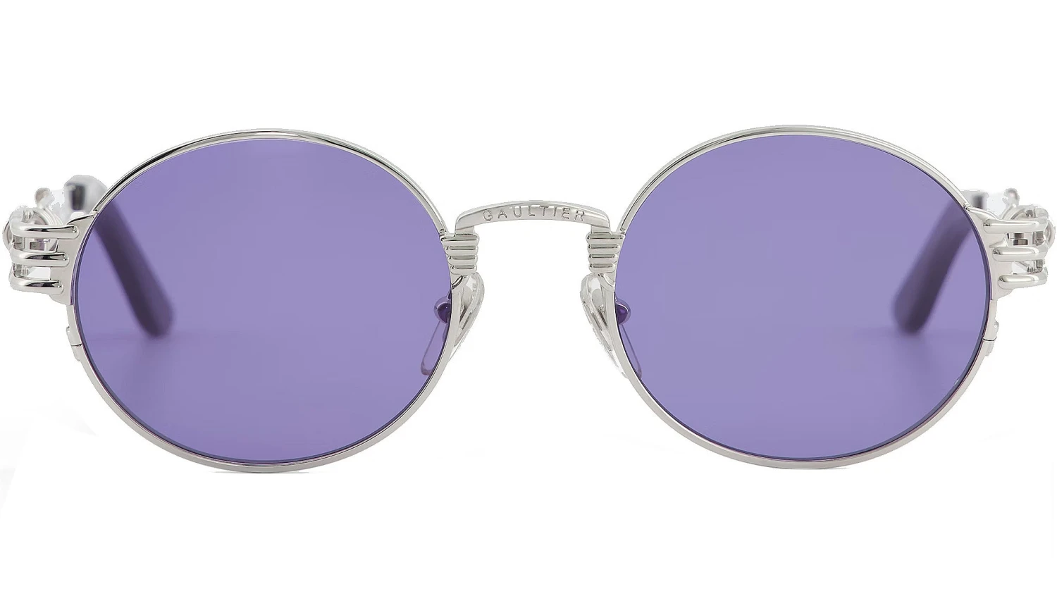 A limited edition Jean Paul Gaultier sunglasses, in collaboration with Karim Benzema. Round silver-tone frames and metallic temples with spring detail. Varnished metal alloy temples with gold-flash treatment. “Gaultier” engraved bridge. Inside temples engraved with “KB9” and a serial number. Mazzucchelli acetate temple tips. Blue/violet lens color. Category 3 UVA and UVB filter. Anti-glare treatment. Materials: 75% Metal, 10% Acetate, 15% Glass.