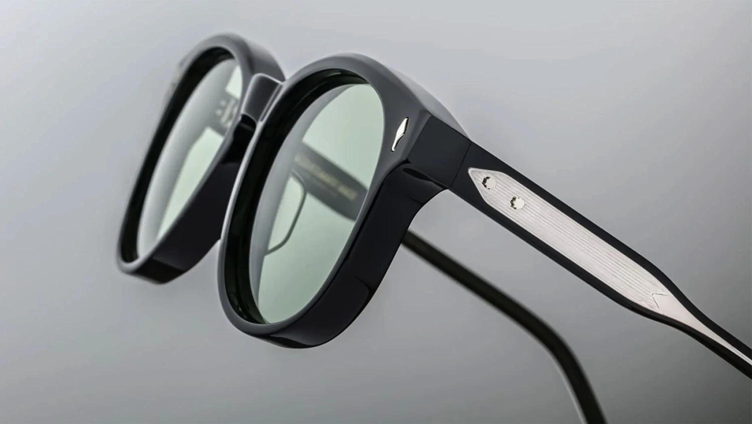 Black 10mm cured cellulose acetate frame with custom double-laminated acetate temples, accented by sterling silver precious metal hardware and fern green glass lenses. Features include a sterling silver signature arrowhead front pin, exposed Vauxhall wirecore, and a silver tension-secured custom 5-barrel hairline hinge. The 4-base lenses offer a backside anti-reflective treatment, delivering 100% UV protection. Frame total width: mm.