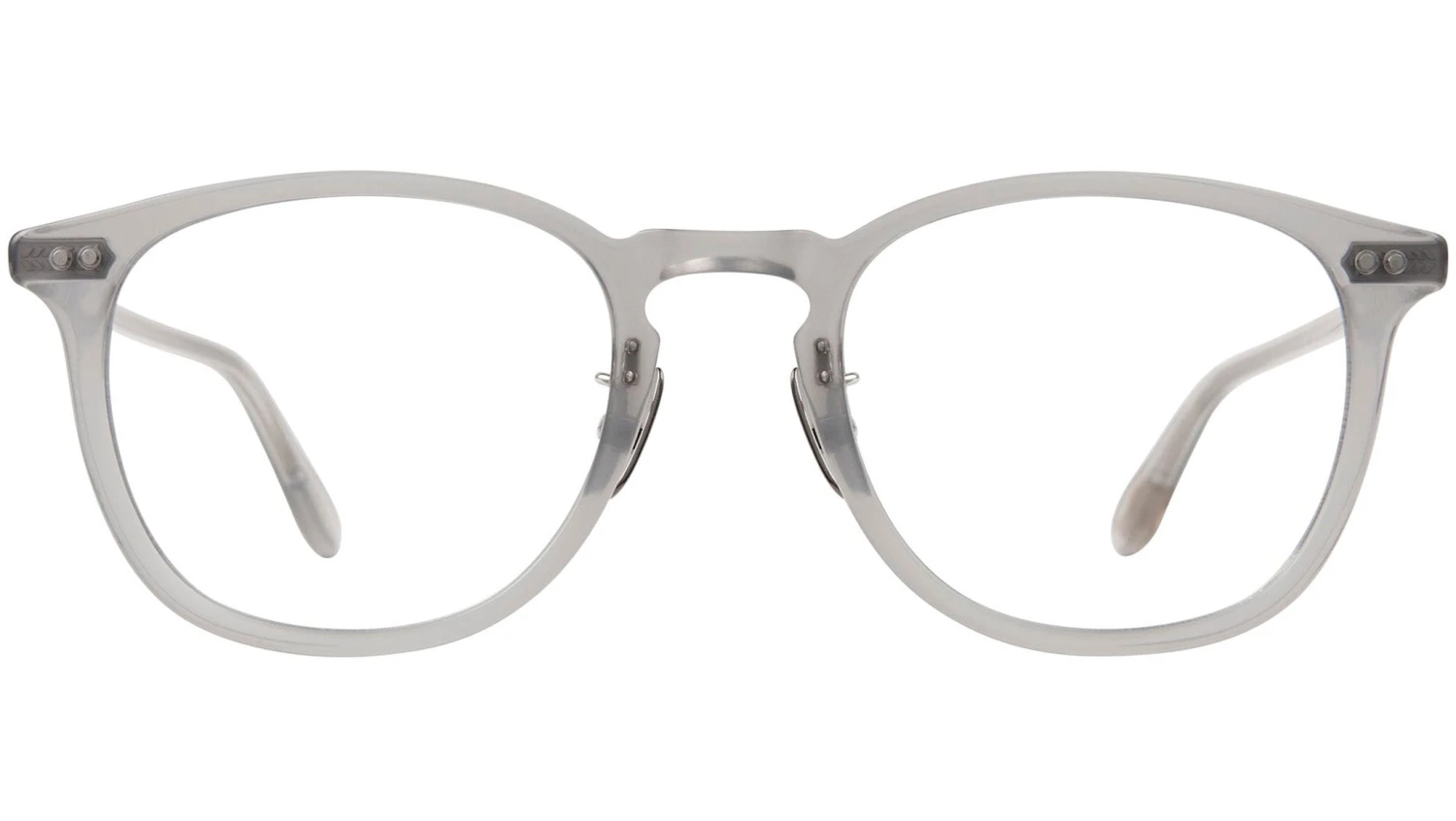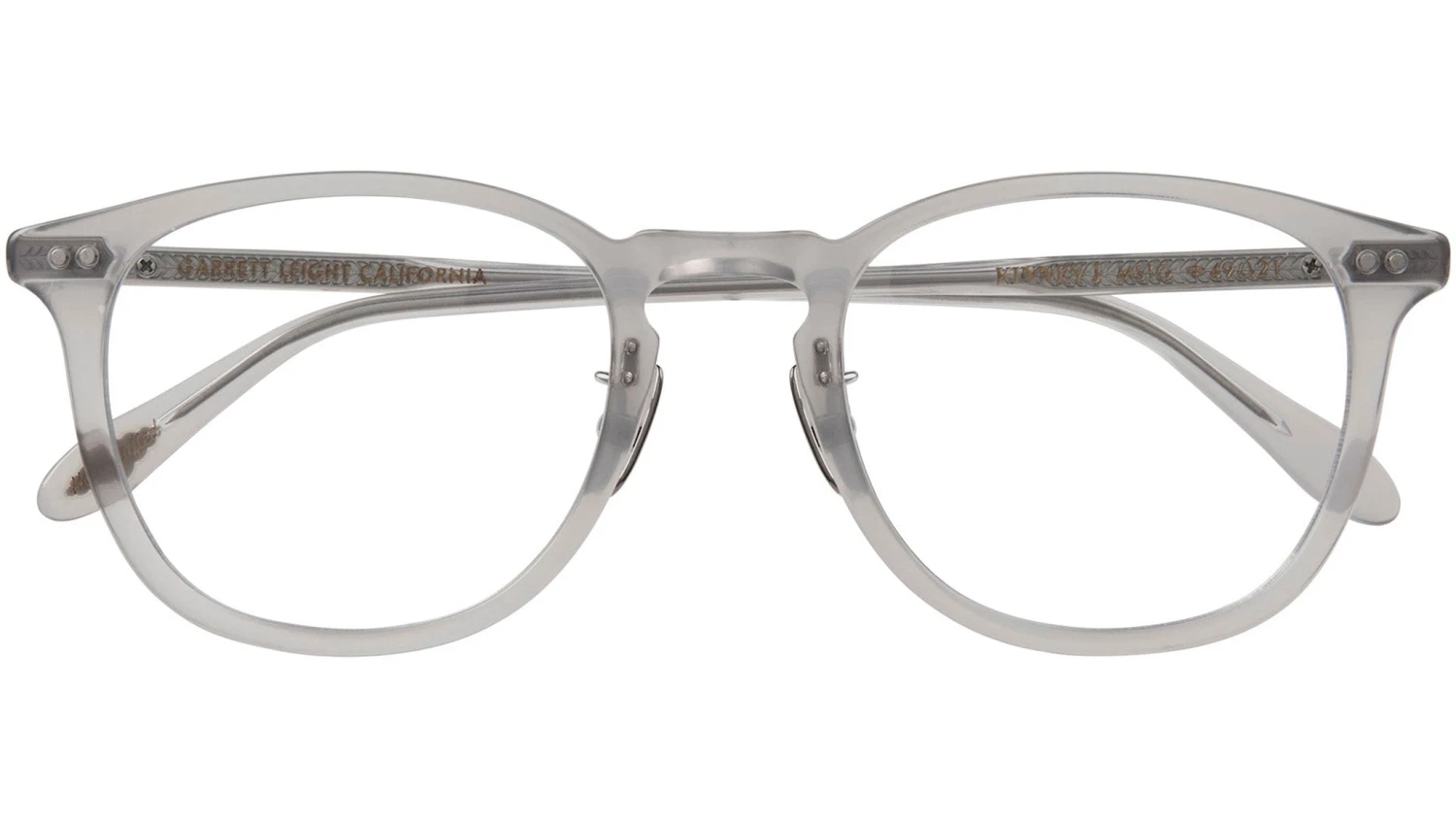 Garrett Leight Kinney J glasses featuring misty grey squared acetate frame and demo lens lenses. The elevated version of the classic Kinney is meticulously crafted in Japan using exclusive acetate colors and luxurious metal accents. This frame showcases distinctive features such as the Fern filigree end piece and core wire, custom temple end caps, and a cloud decal on the temple tips. It is equipped with adjustable titanium nose pads for optimal comfort and fit. The product includes hand-finished details, optical quality CR-39 lenses, and is made of cured cellulose acetate. Additionally, it comes with an exclusive Garrett Leight Blue hard case and a cleaning cloth, all presented in a rigid box, making it a refined accessory suitable for any unisex fashion. Brand line: Forever Classics. Style code: 1168. Color code: MSTG. Authorized Garrett Leight online reseller. Your glasses will include the original case and accessories and are covered by a 12-month global warranty.