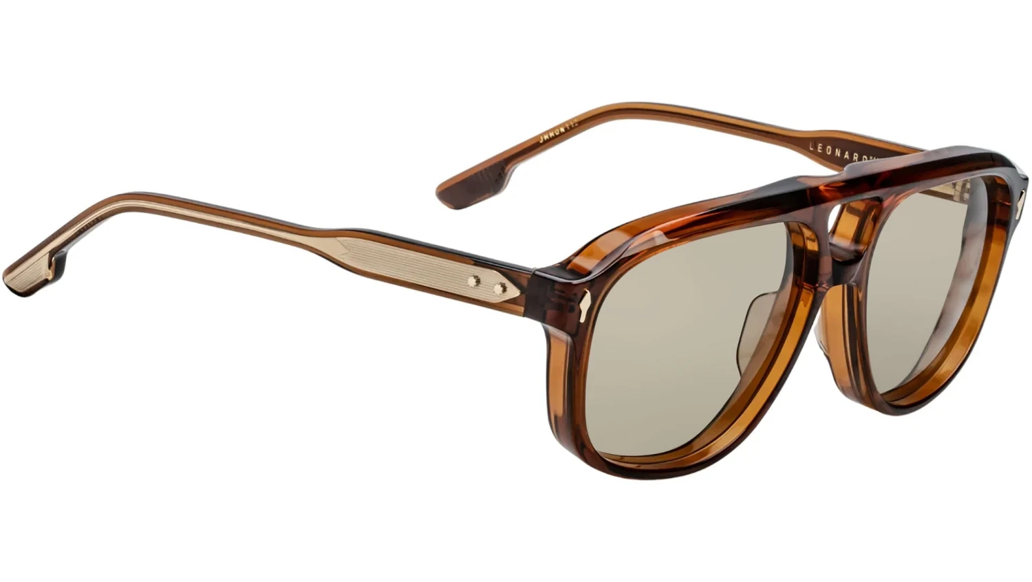 BROWN 10MM CURED CELLULOSE ACETATE FRAME WITH CUSTOM DOUBLE LAMINATED ACETATE TEMPLES FEATURING PRECIOUS METAL HARDWARE AND BROWN GLASS LENSES DARK GOLD SIGNATURE ARROWHEAD FRONT PINEXPOSED DARK GOLD VAUXHALL WIRECOREDARK GOLD TENSION-SECURED CUSTOM 5 BARREL HAIRLINE HINGEKHAKI GLASS 6 BASE LENSES WITH BACKSIDE ANTI-REFLECTIVE TREATMENT 100% UV PROTECTION