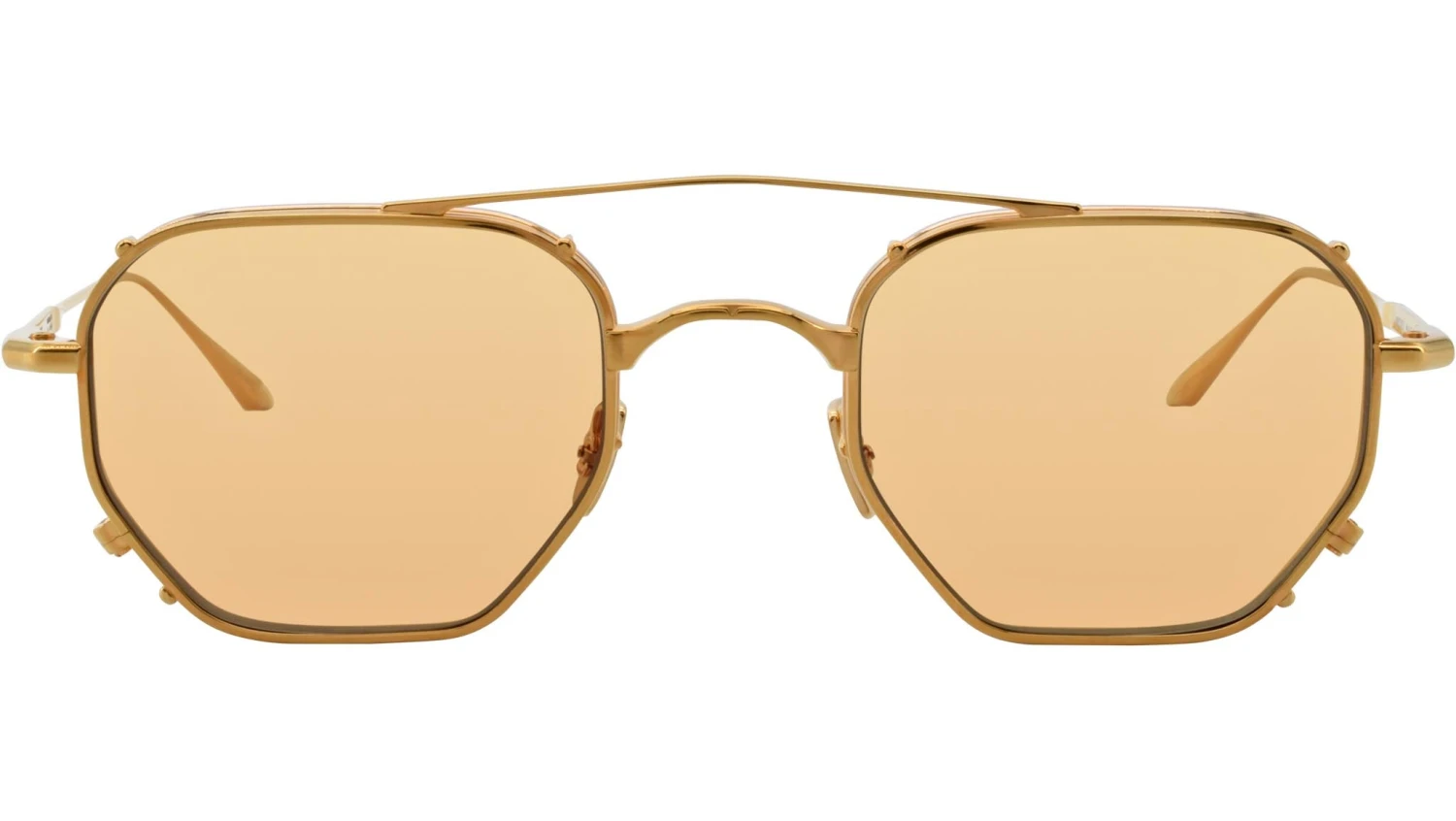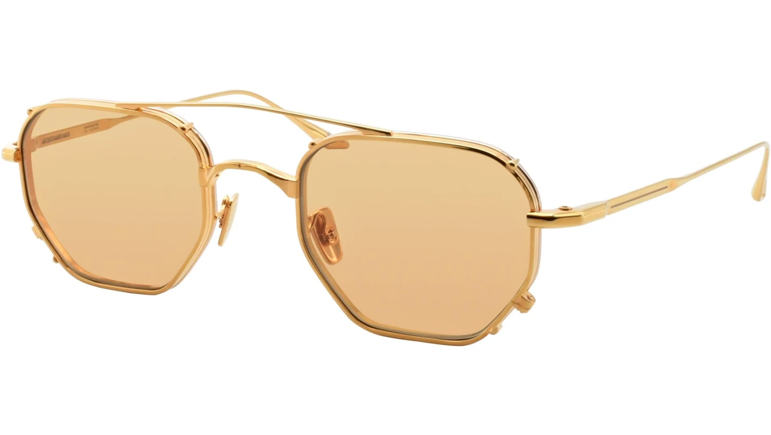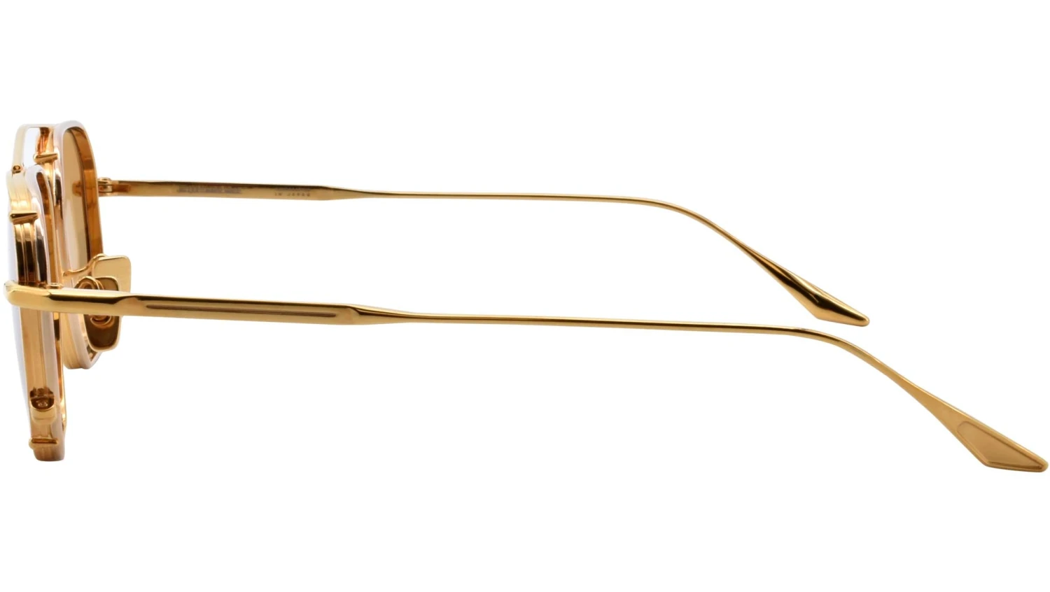 Crafted with precision, the frame of these glasses is made from 100% beta titanium in a classic gold hue, beautifully paired with captivating brown lenses. The hidden hinge in dark gold ensures seamless integration and functionality. Adding a touch of sophistication, the dark gold back eye rim enhances the overall design. The custom nose pads feature the logo and intricate hairline engraving for a personalized touch. The 4-base lenses, in sepia CR39, are treated with backside anti-reflective technology, providing both style and optimal visual clarity.