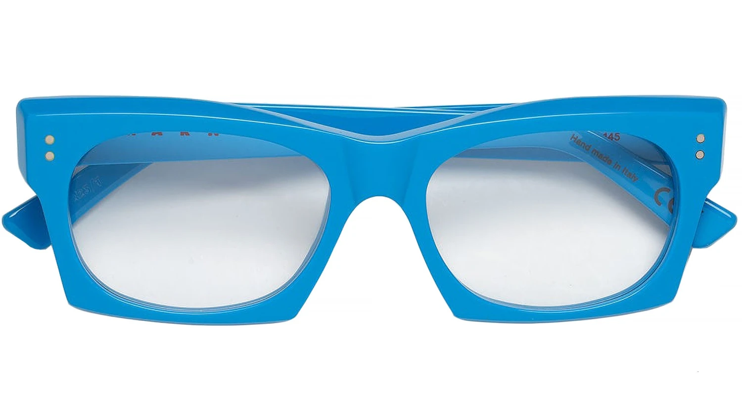 Designed exclusively for Marni, Edku is a sharp and angular silhouette characterised by carefully sculpted rims. The model features geometric temples and a squared lower line, with rounded lenses softening the austere appearance of the silhouette. For this optical edition of the shape, the rims have been carved to ensure lightness and wearability in everyday use. Metal rivets on the front and a visible metal core on the temples add a sophisticated touch to this bright blue frame. Sizes: R Lens Width: 54 mm. Frame Front: Frame Side: 145 mm. Product Code Size R: 56I