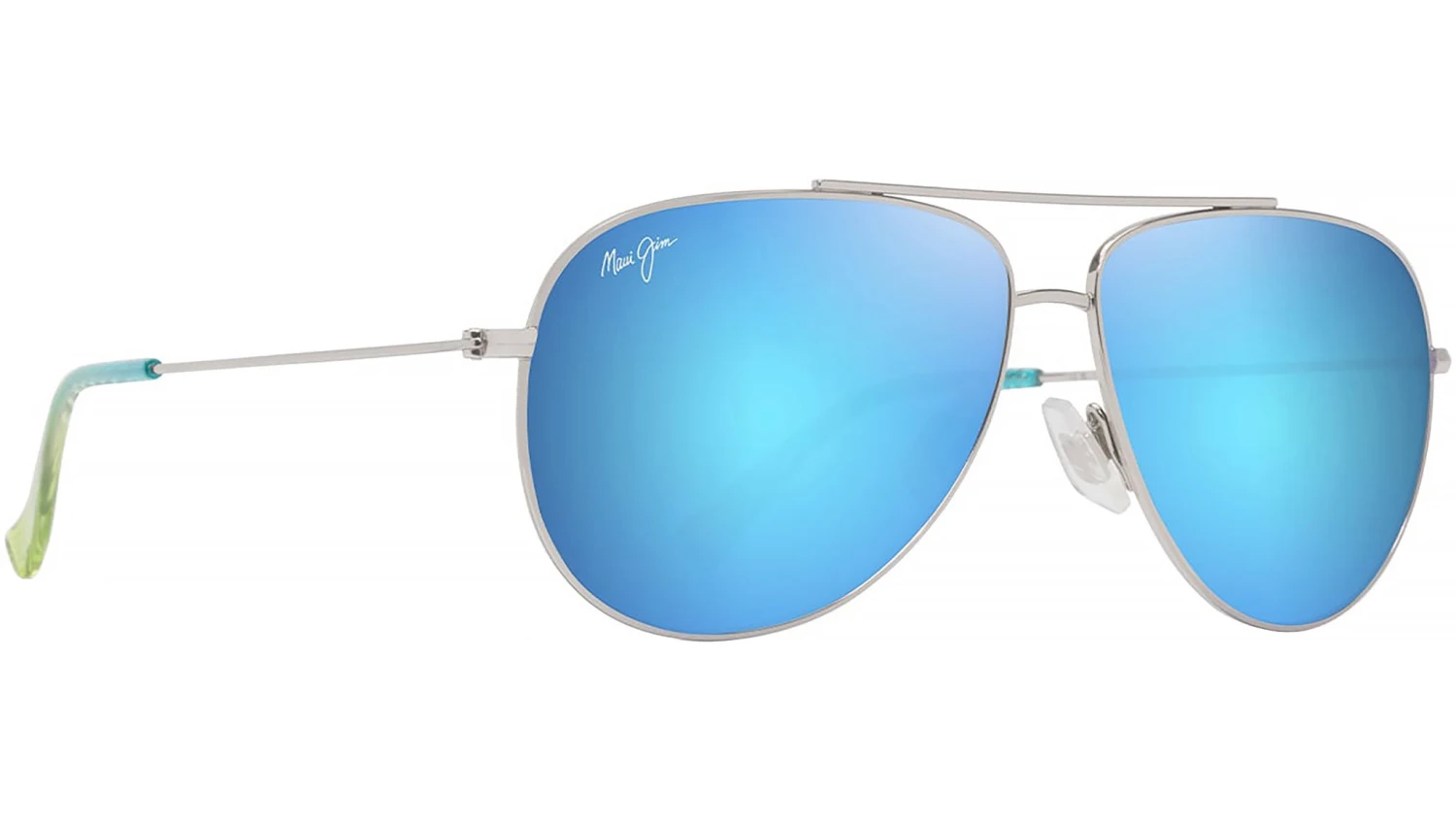 Maui Jim Hauoli sunglasses featuring shiny silver / blue & green pilot monel frame and blue hawaii lenses. The Maui Jim Hau‘oli sunglasses bring a refined elegance to the classic teardrop aviator silhouette, offering a sophisticated balance of style and performance. Designed with MauiPure lenses and PolarizedPlus2 technology, they deliver vivid, high-contrast views across a range of landscapes, from city skylines to coastal vistas. The large frame features a light gold finish with crystal-accented temples, complemented by transparent tips showcasing a colorful wavy pattern. Adjustable silicone nose pads and a double bridge ensure comfort and stability. Suitable for all genders, this aviator model exemplifies Maui Jim’s signature blend of advanced optics and timeless design. Brand line: Lifestyle. Style code: B665. Color code: 17B. Made in Japan. Authorized Maui Jim online reseller. Your glasses will include the original case and accessories and are covered by a 12-month global warranty.